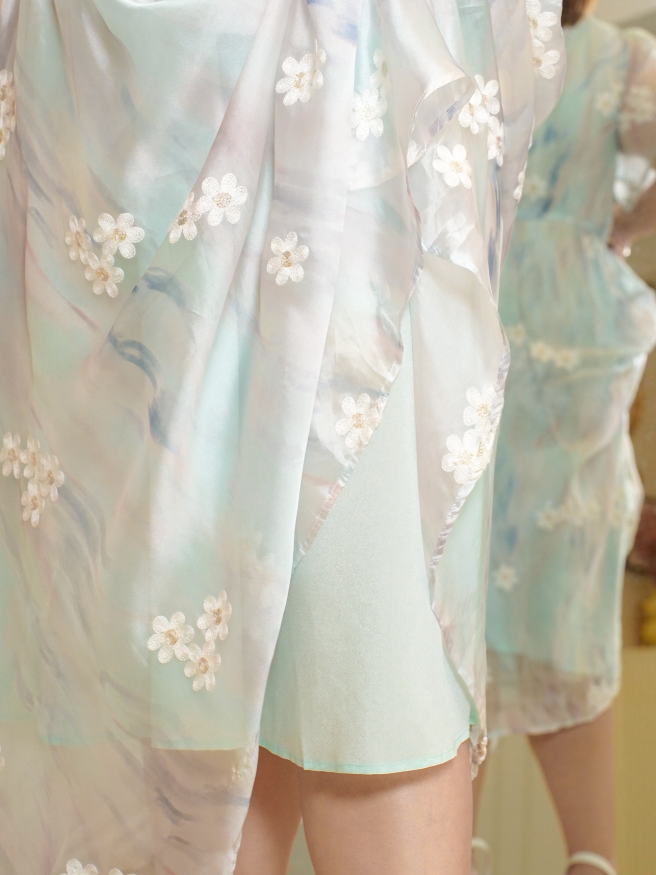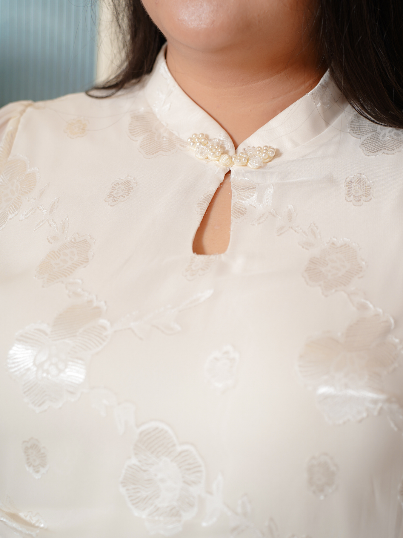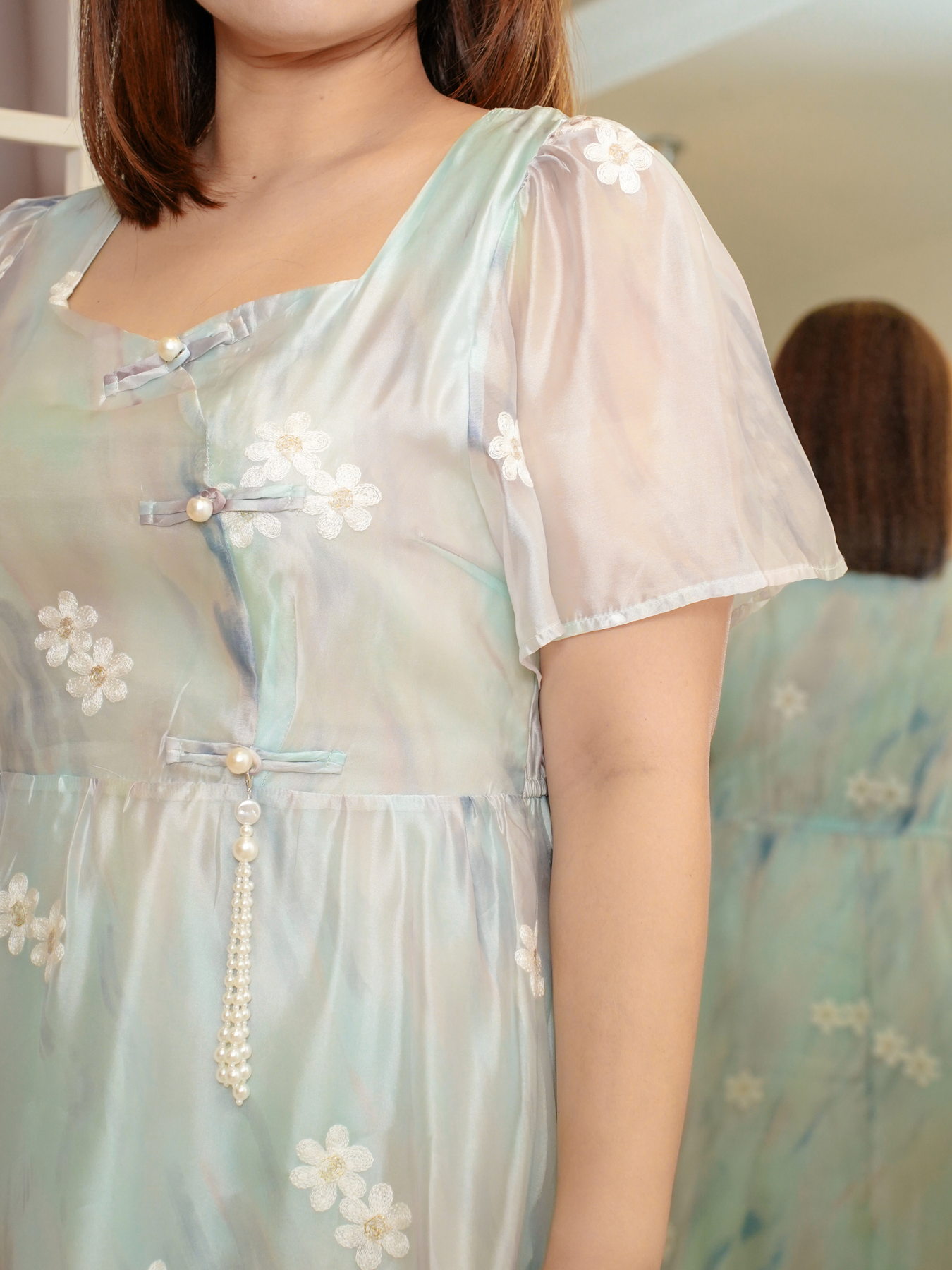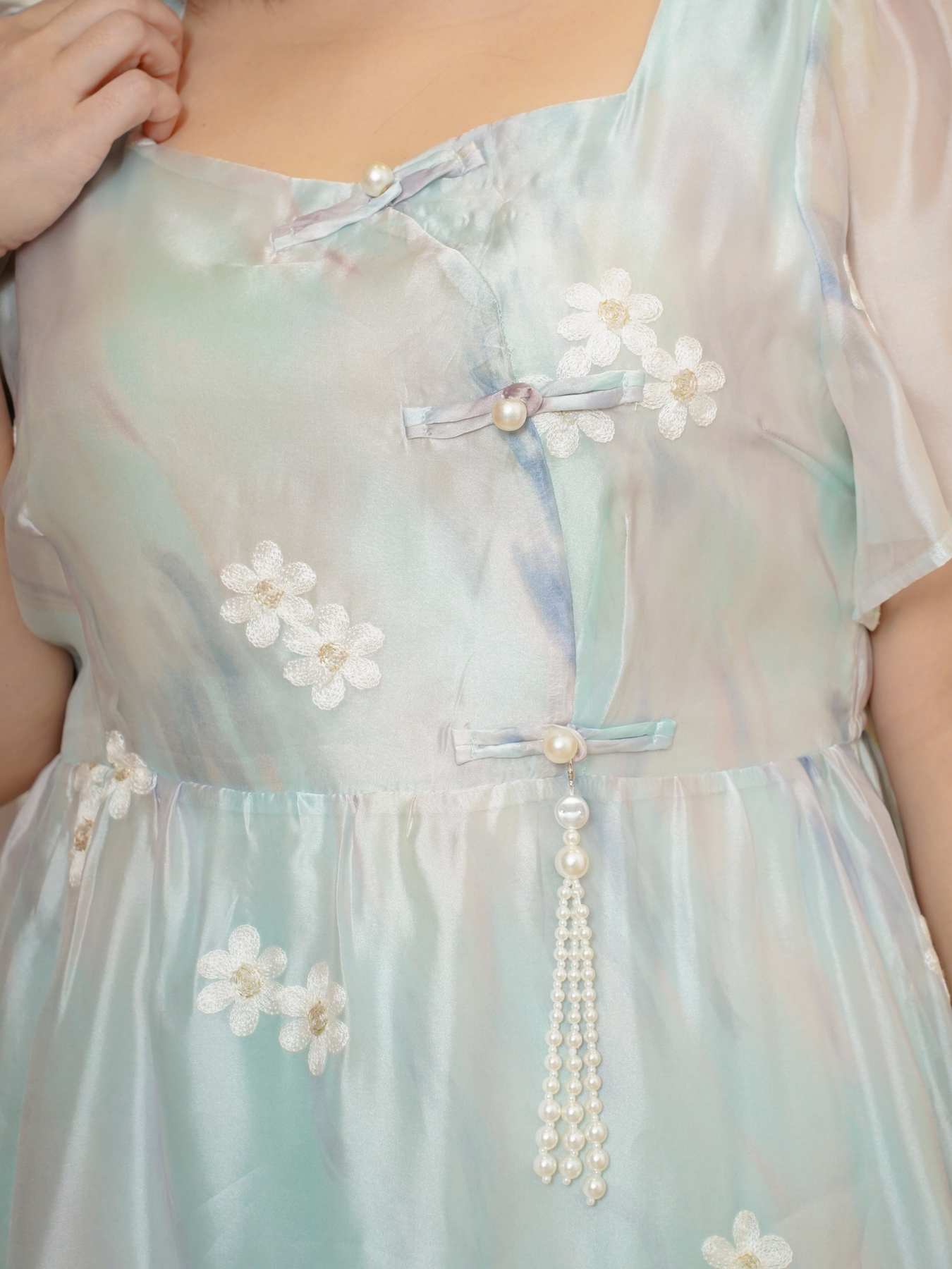 Mandarin collar with functional buttons, drape shoulder, pearls neckline details, back elastic waistband, hidden side zip, transparent sheer layered hem and inner lining.