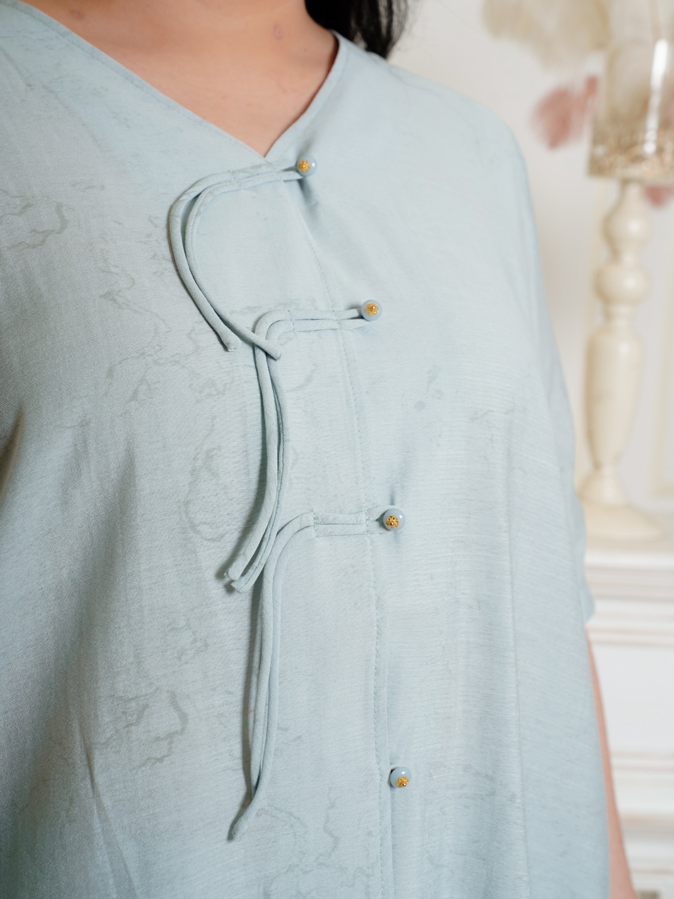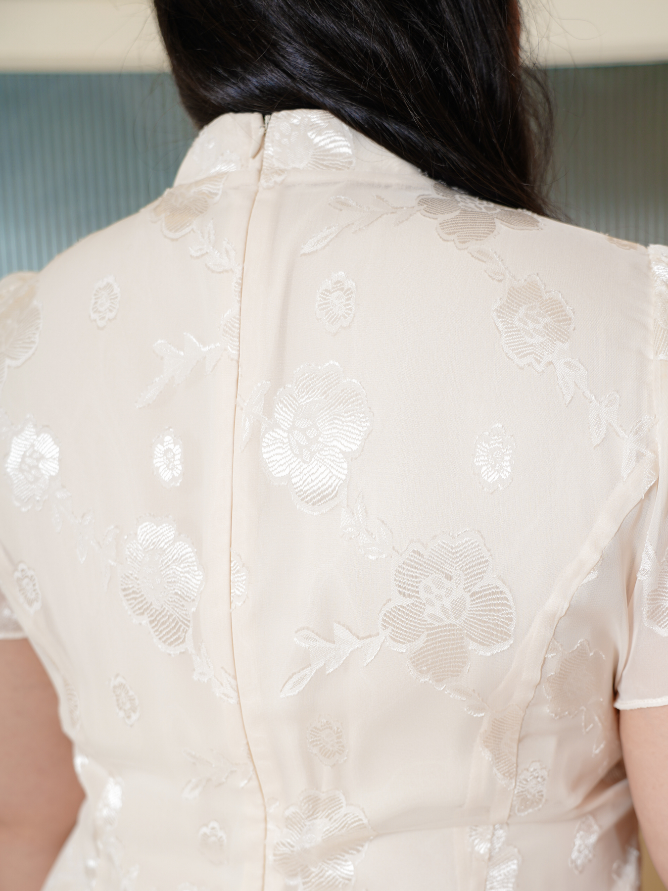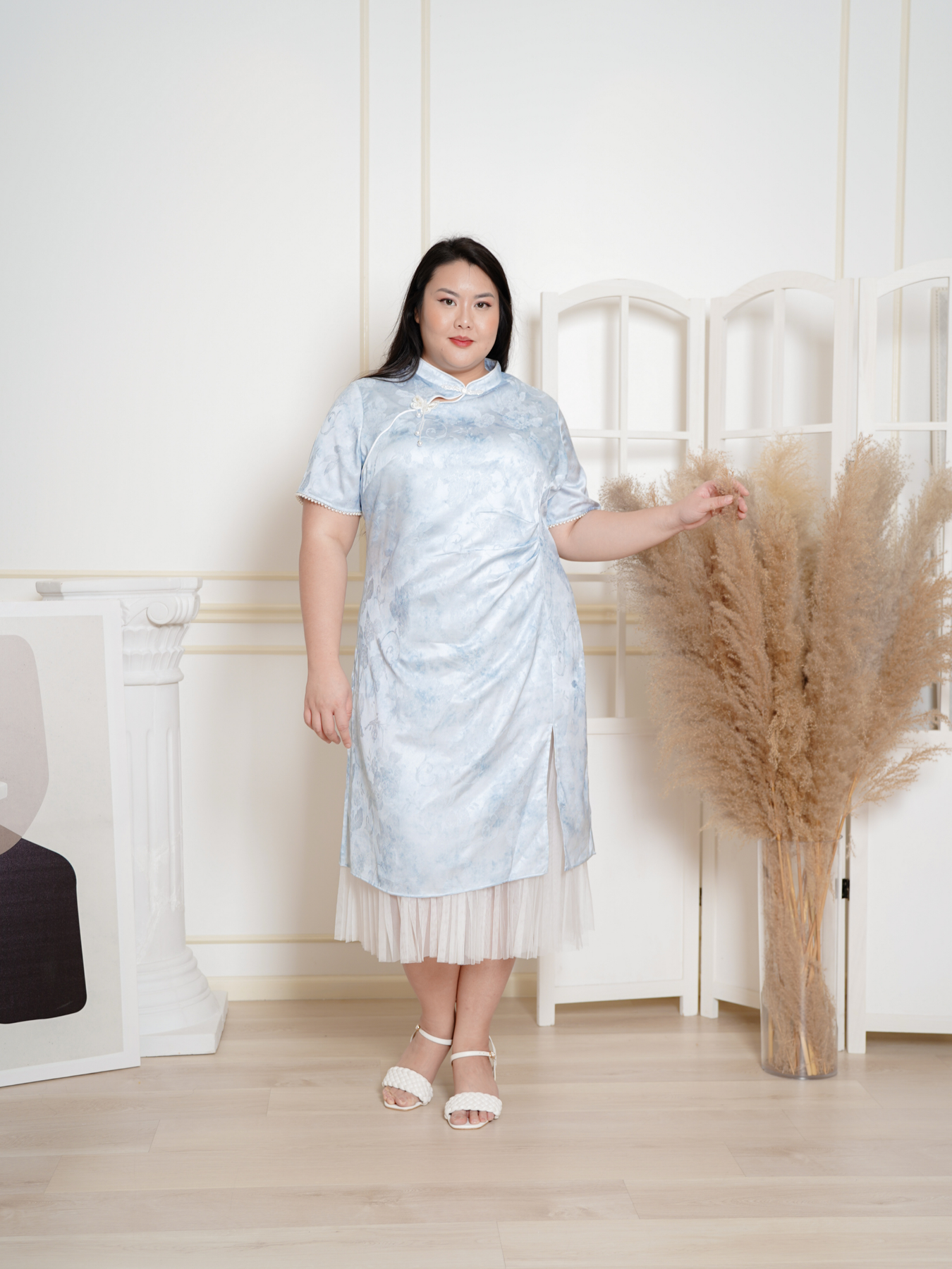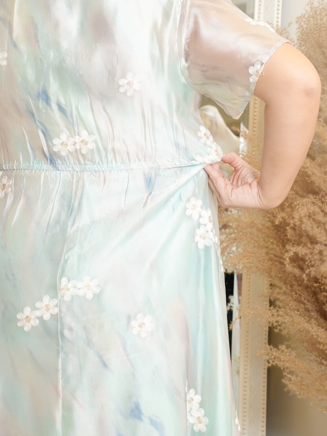 Mandarin collar with functional buttons, drape shoulder, pearls neckline details, back elastic waistband, hidden side zip, transparent sheer layered hem and inner lining.