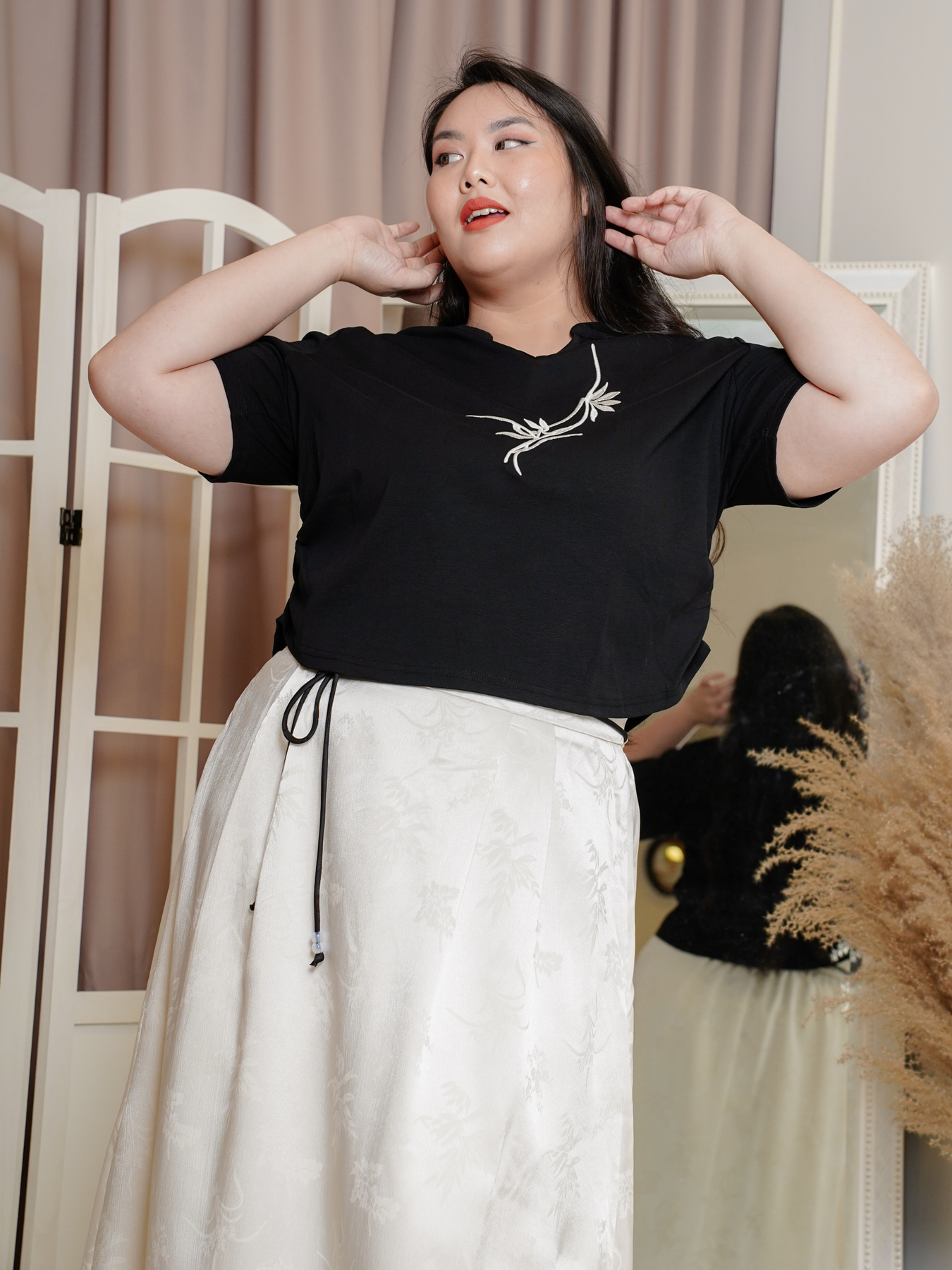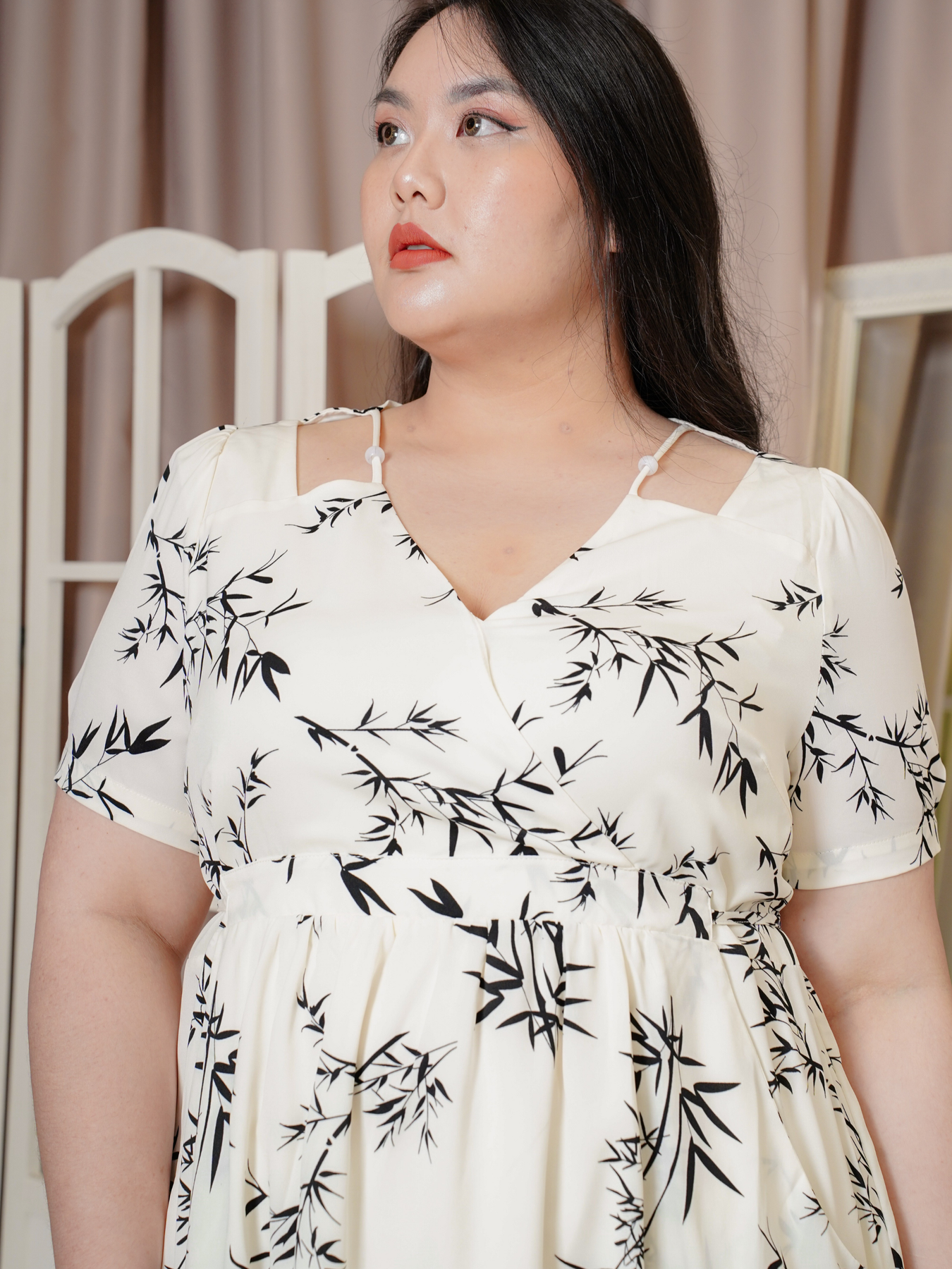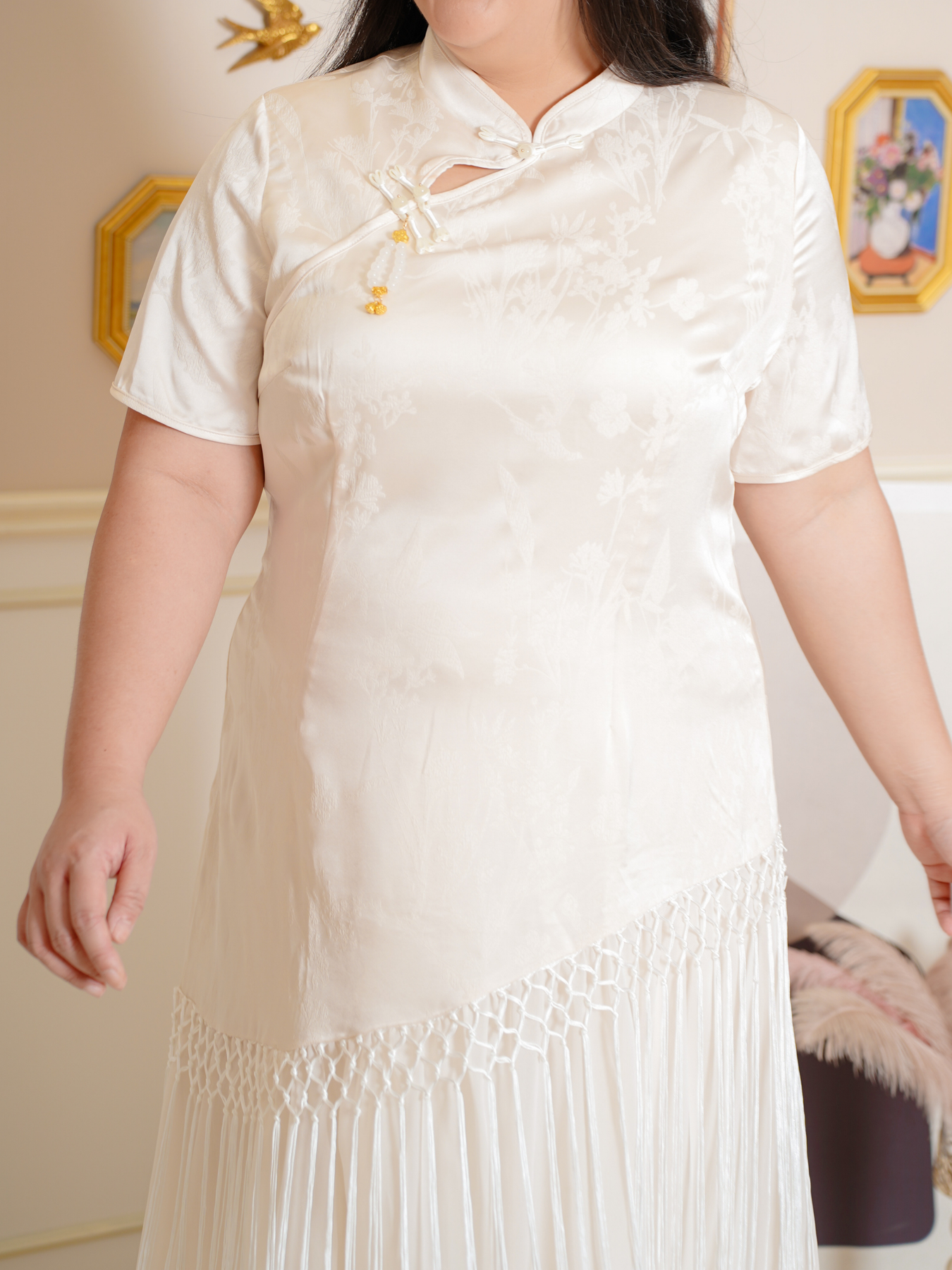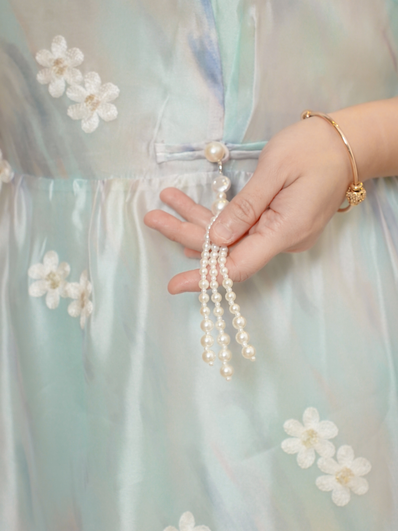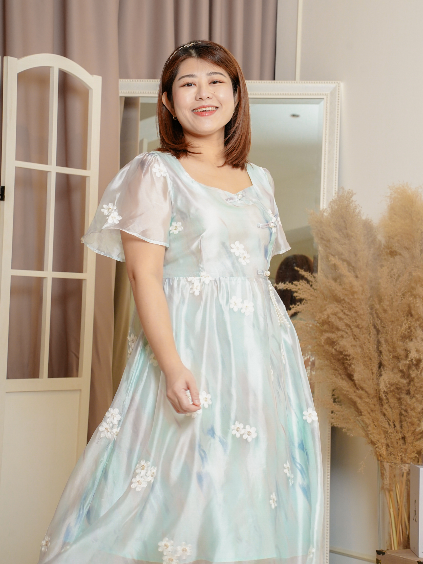 Mandarin collar with functional buttons, drape shoulder, pearls neckline details, back elastic waistband, hidden side zip, transparent sheer layered hem and inner lining.