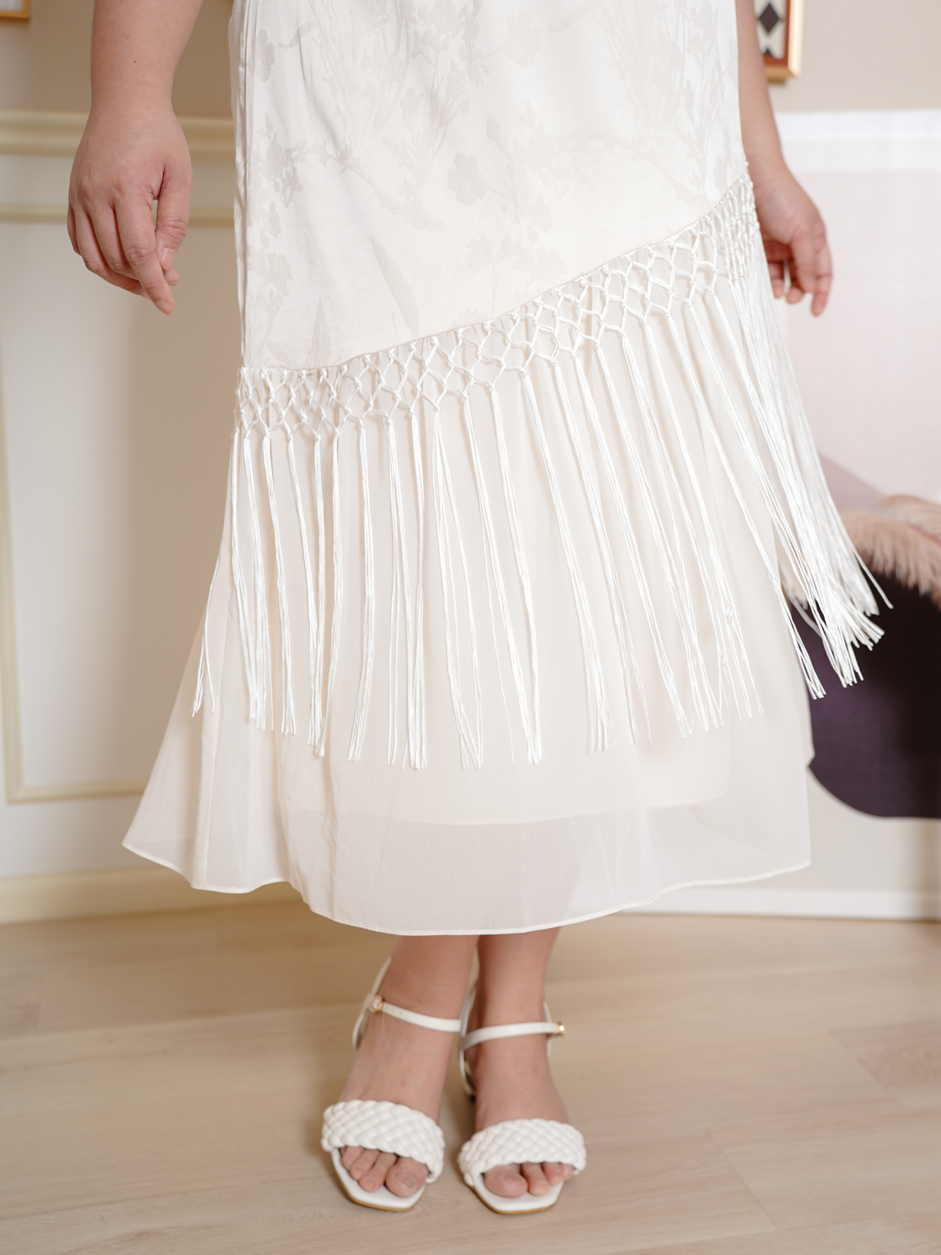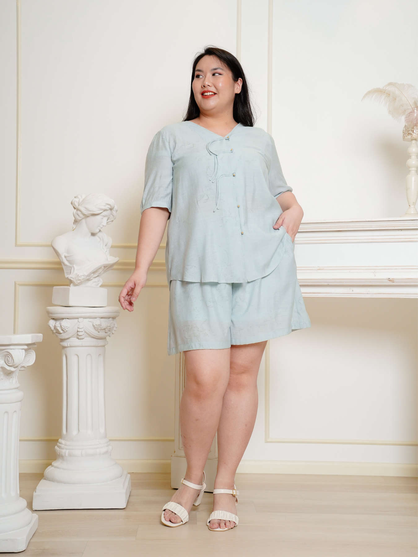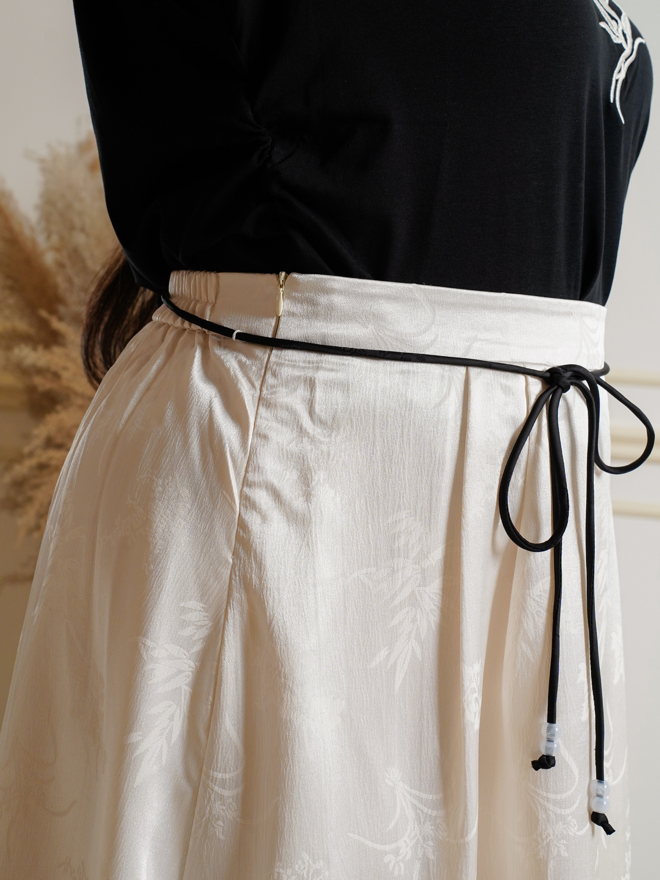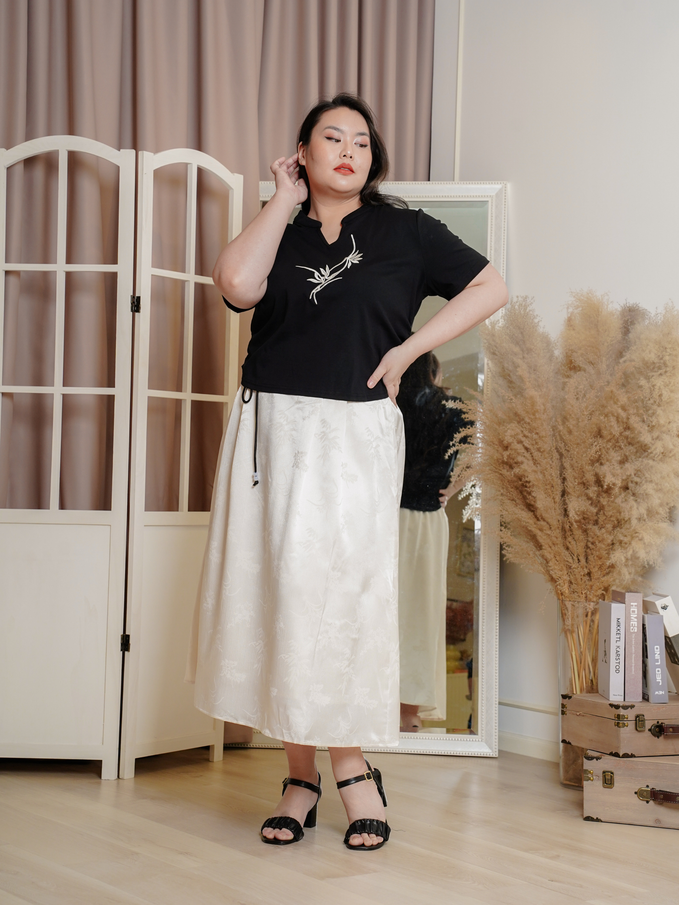 Mandarin collar with functional buttons, drape shoulder, pearls neckline details, back elastic waistband, hidden side zip, transparent sheer layered hem and inner lining.