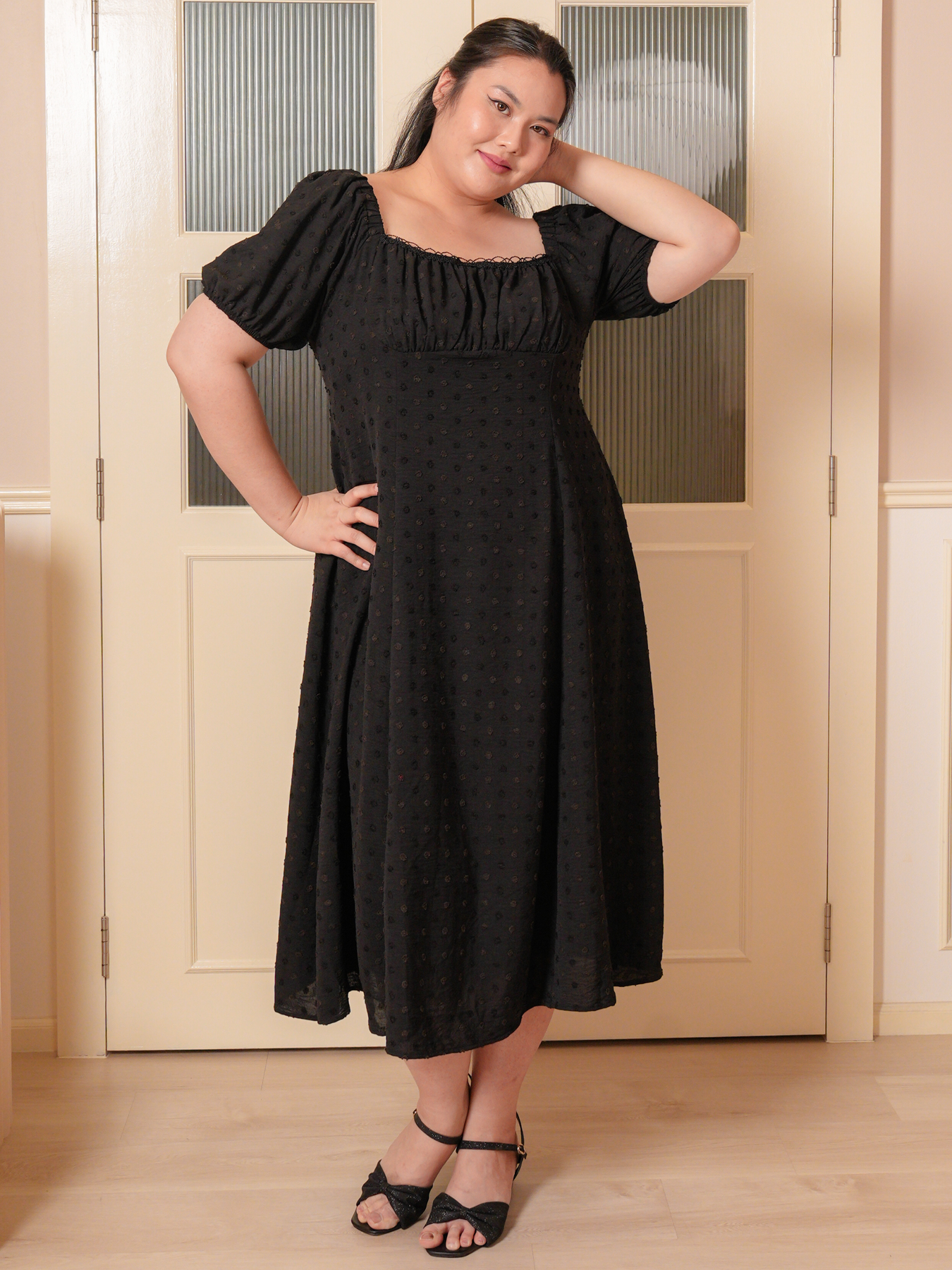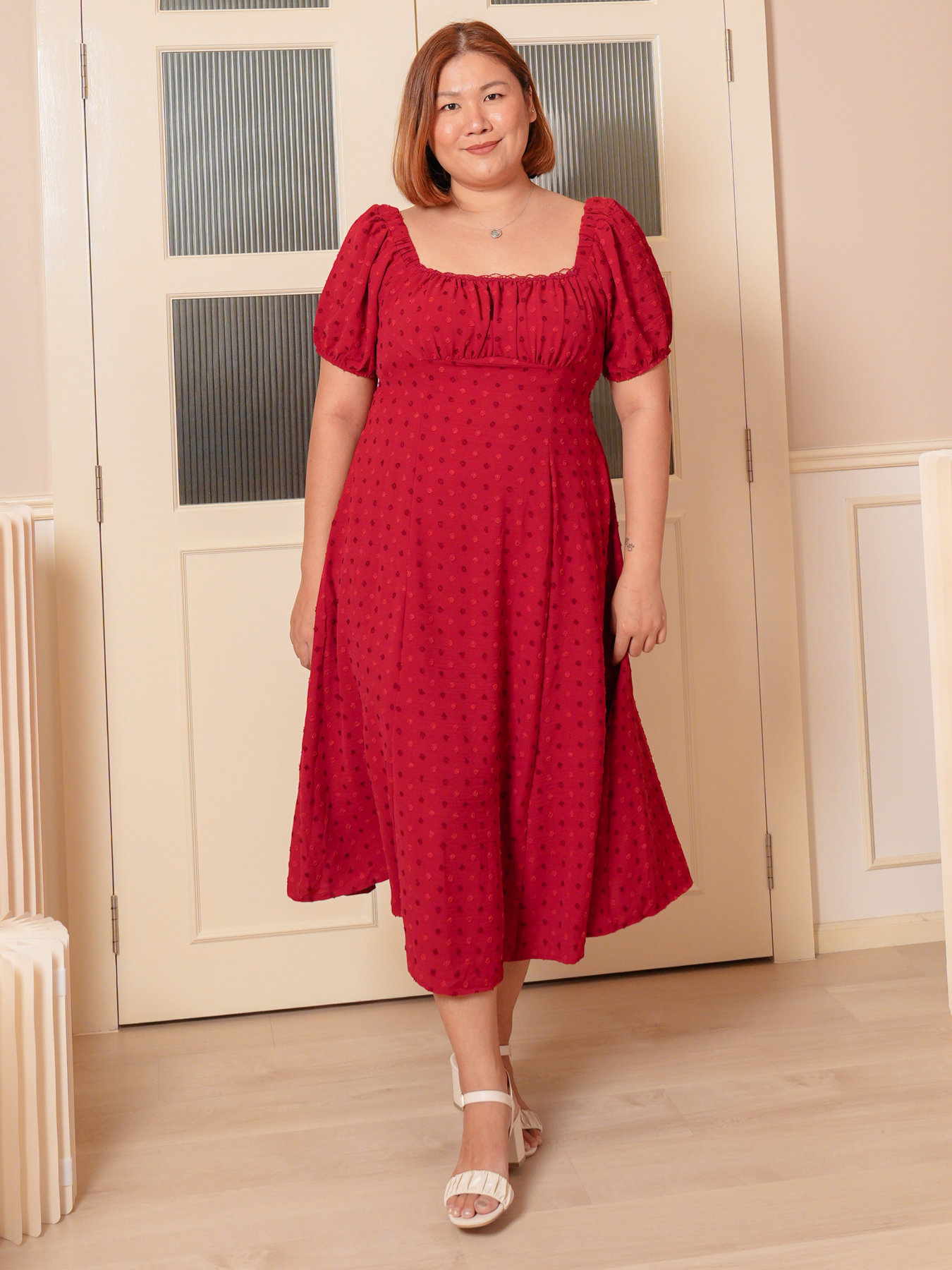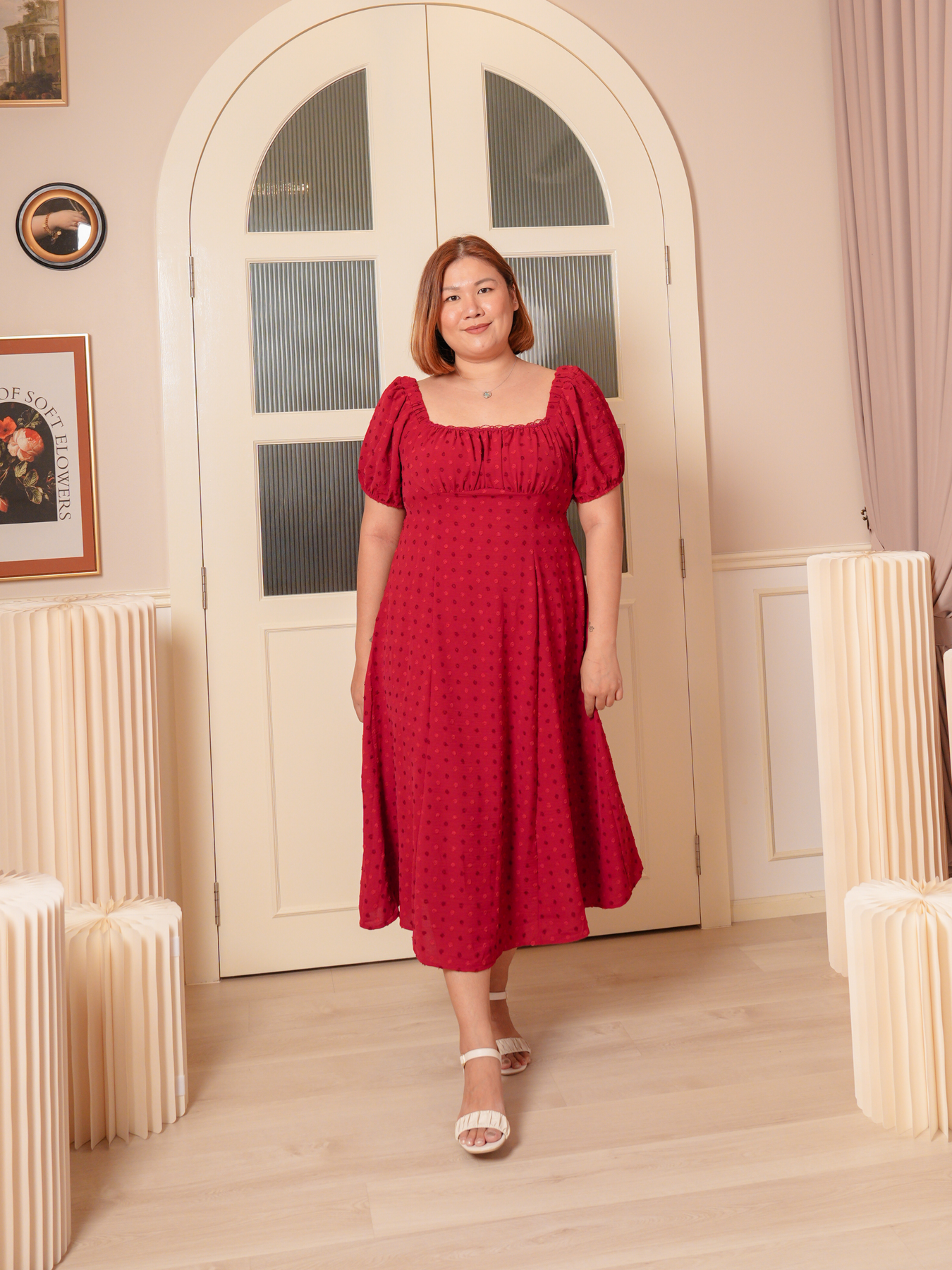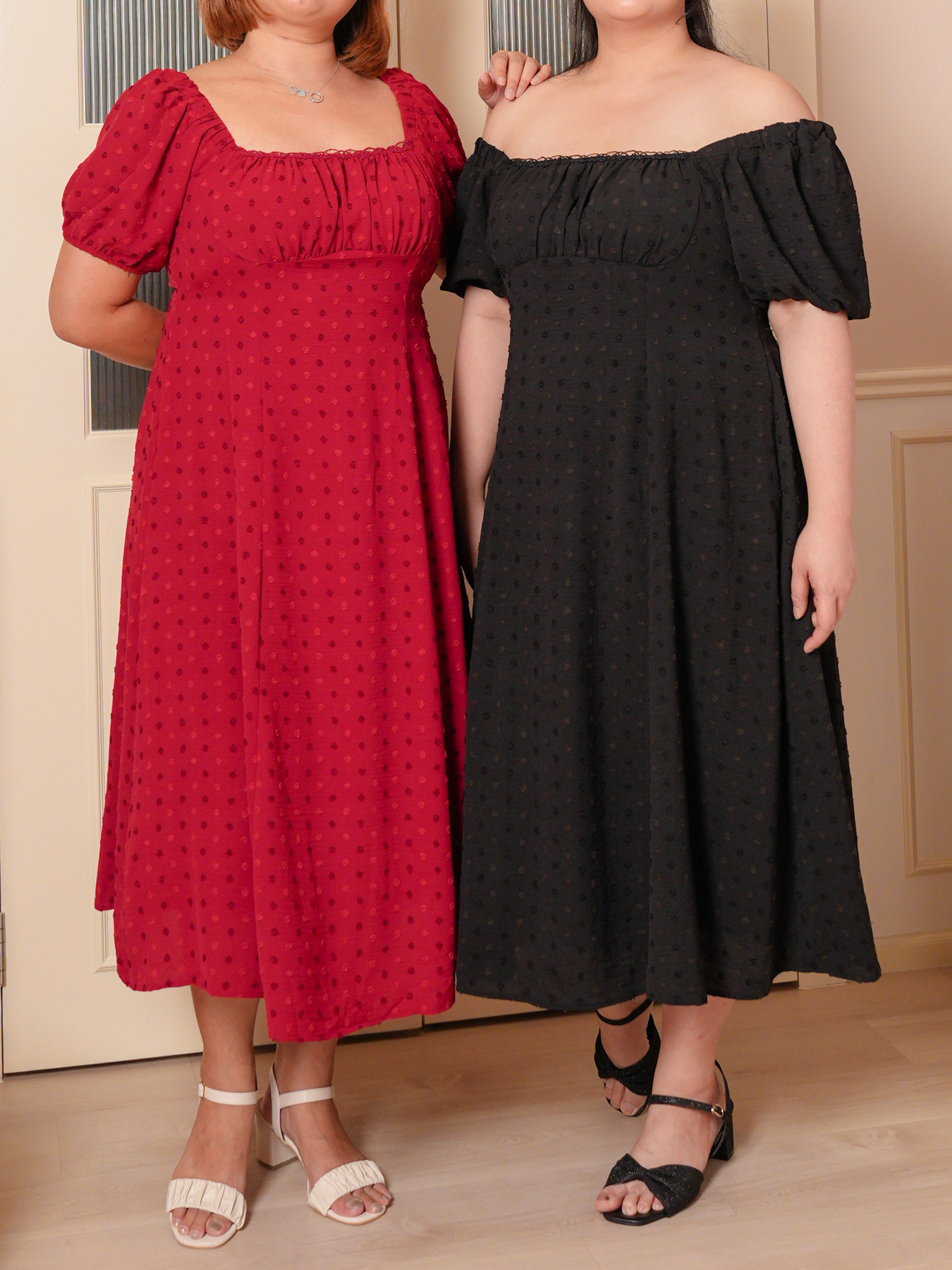 Dress: 3D polkadot jacquard prints, adjustable strap and inner lining