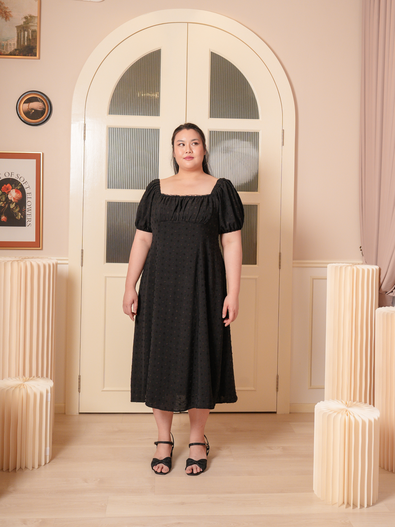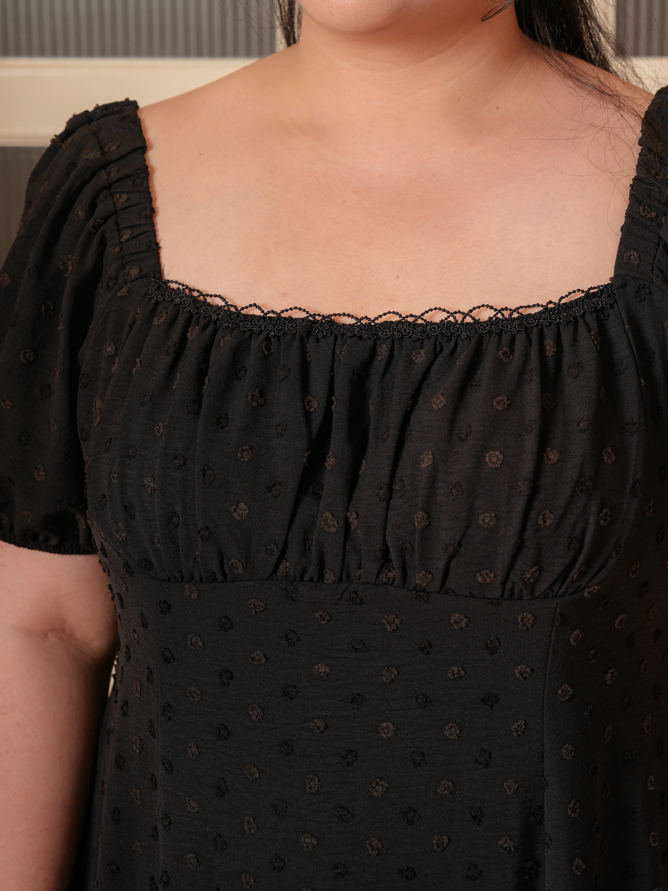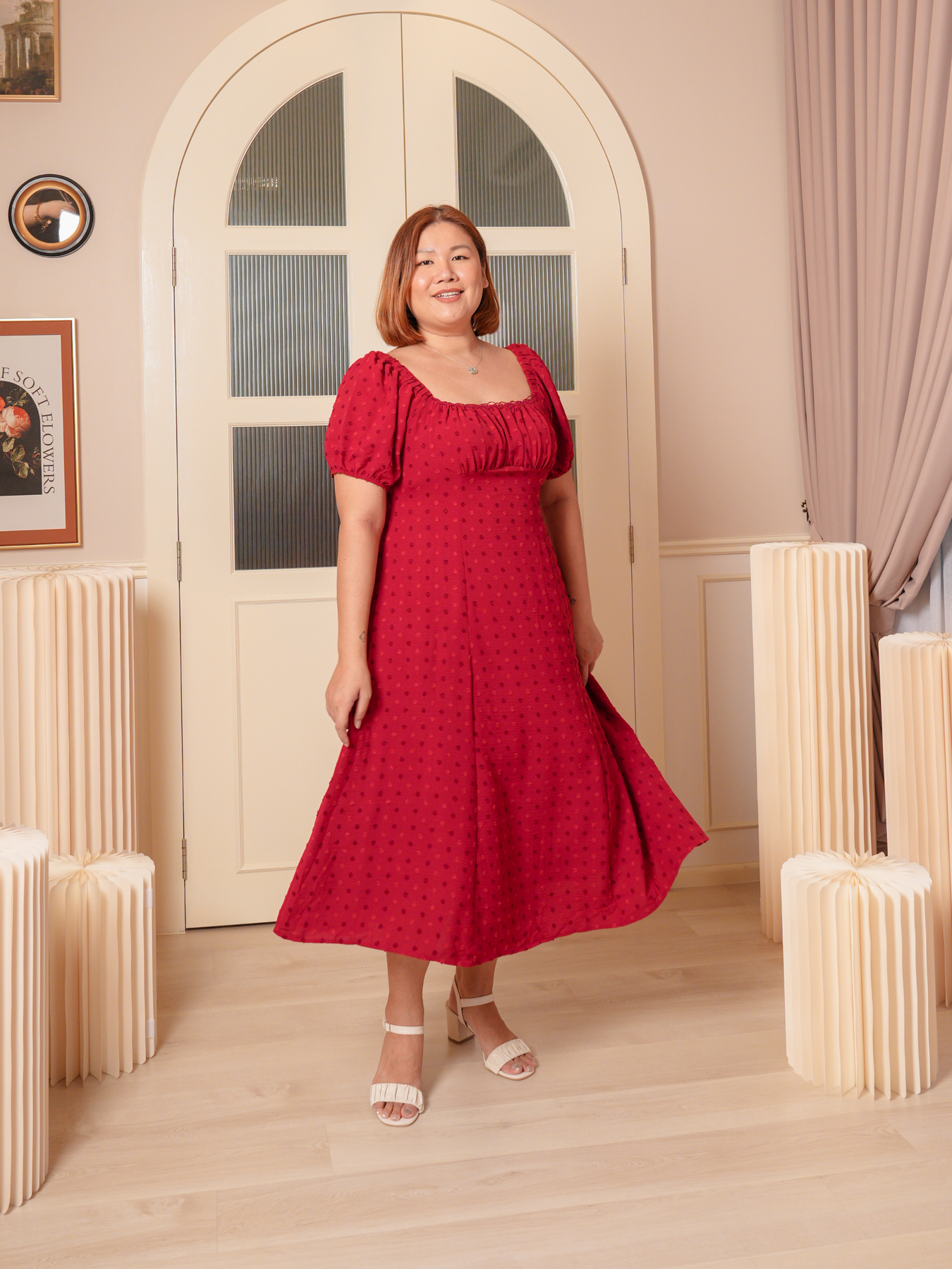 Dress: 3D polkadot jacquard prints, adjustable strap and inner lining