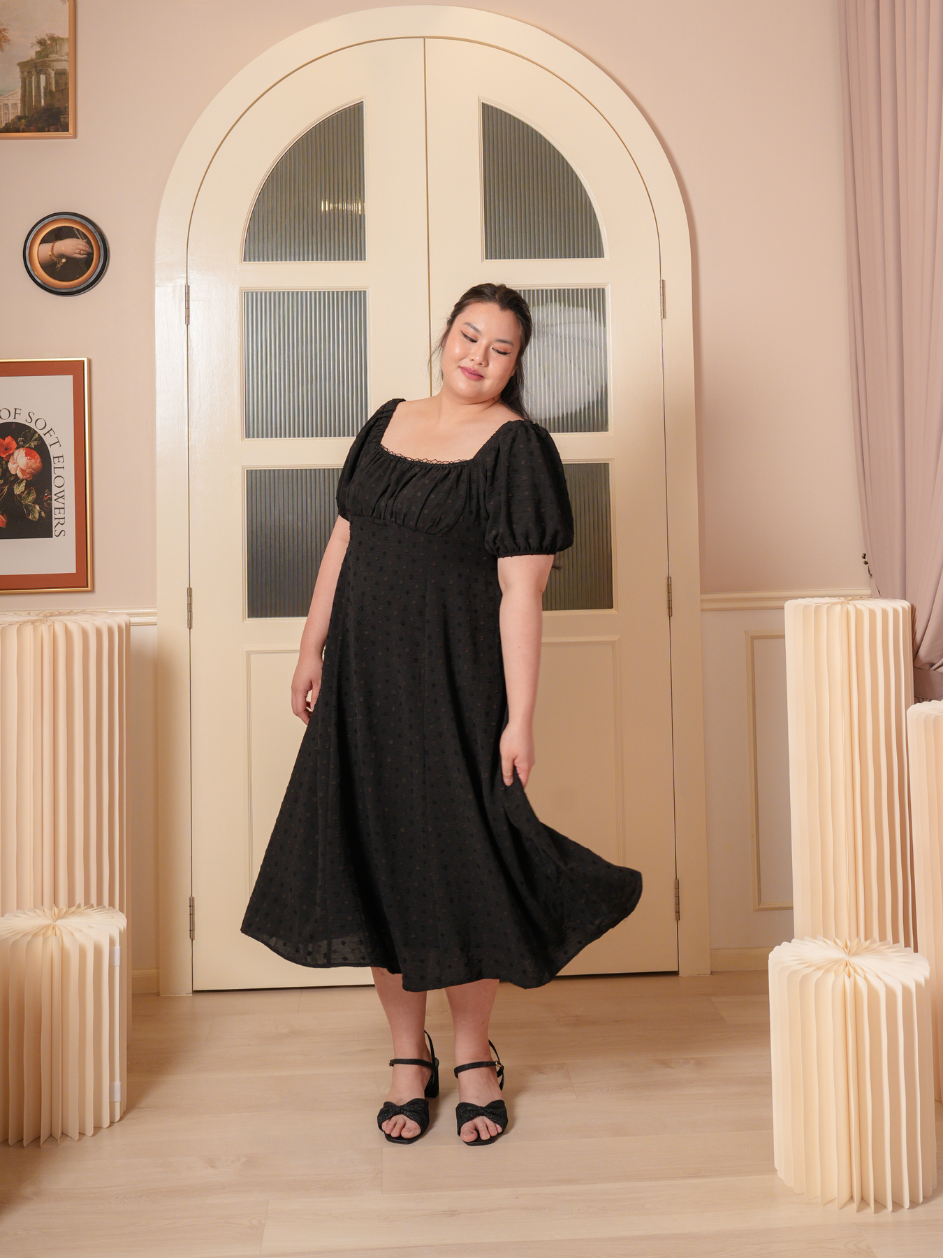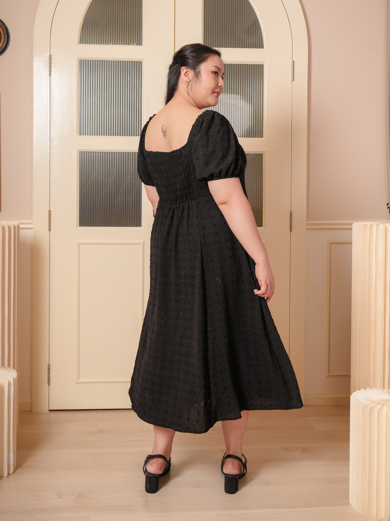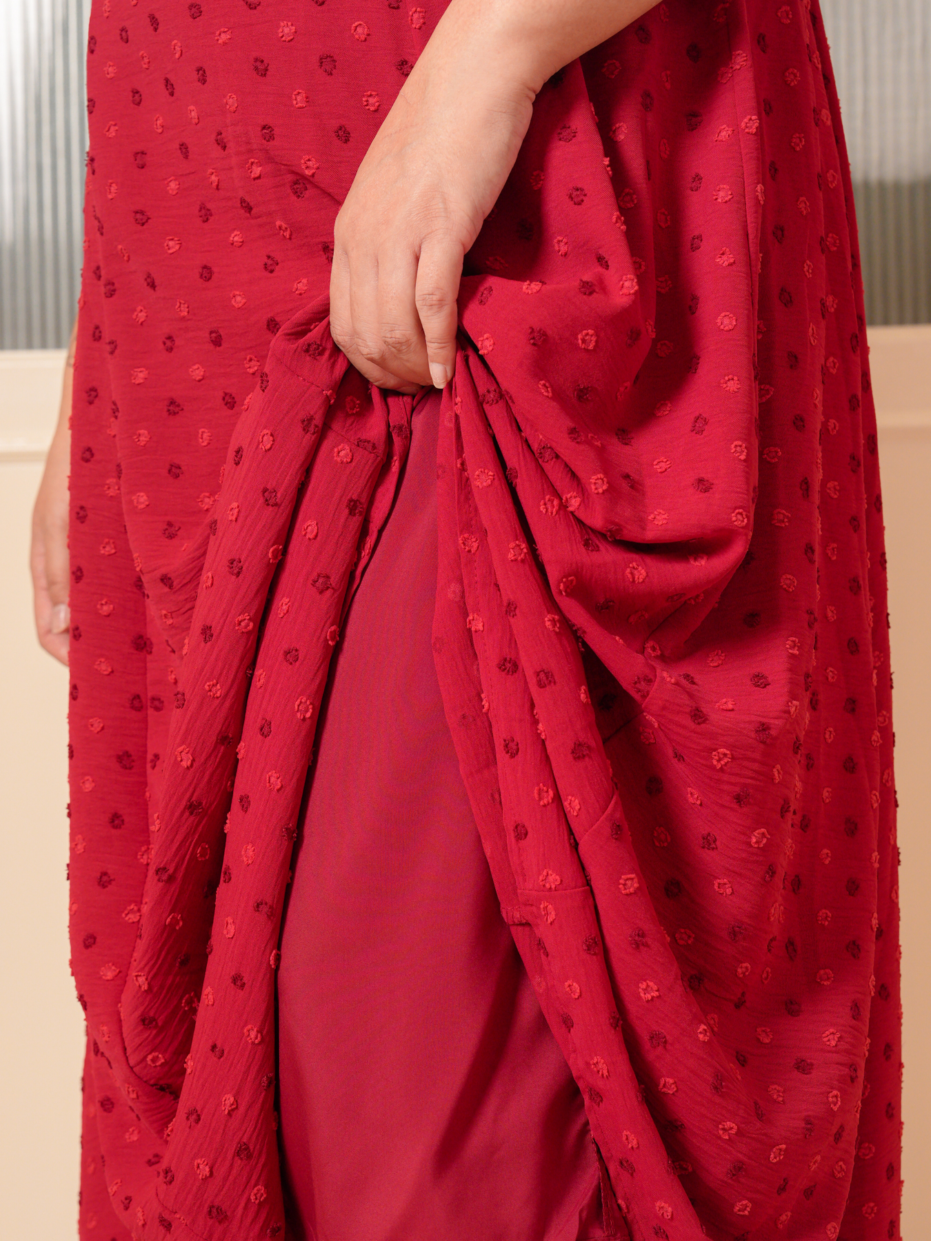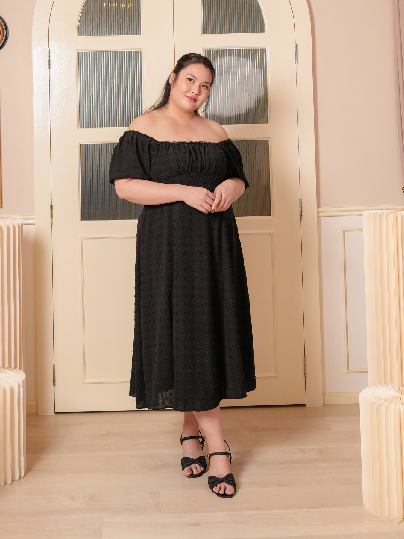 Dress: 3D polkadot jacquard prints, adjustable strap and inner lining