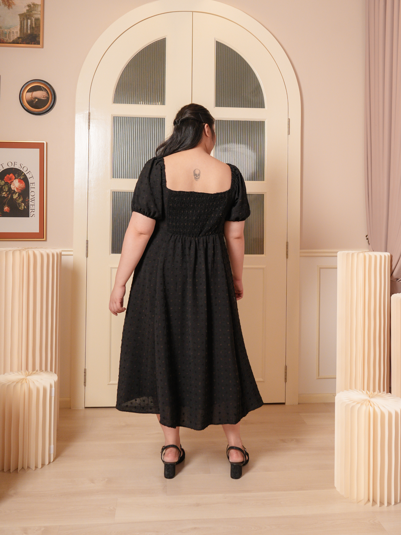 Puff sleeve, back elastic band, elastic sleeve cuff, puff sleeve design, flare hem and fully lined.