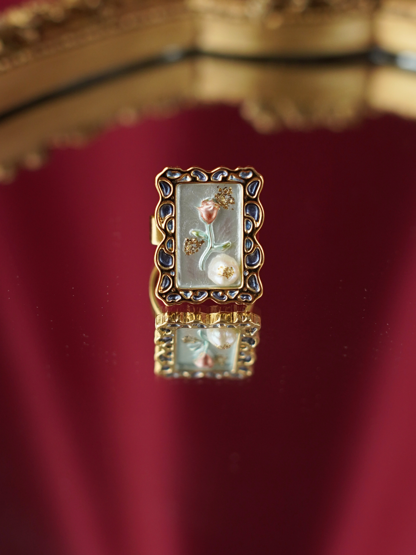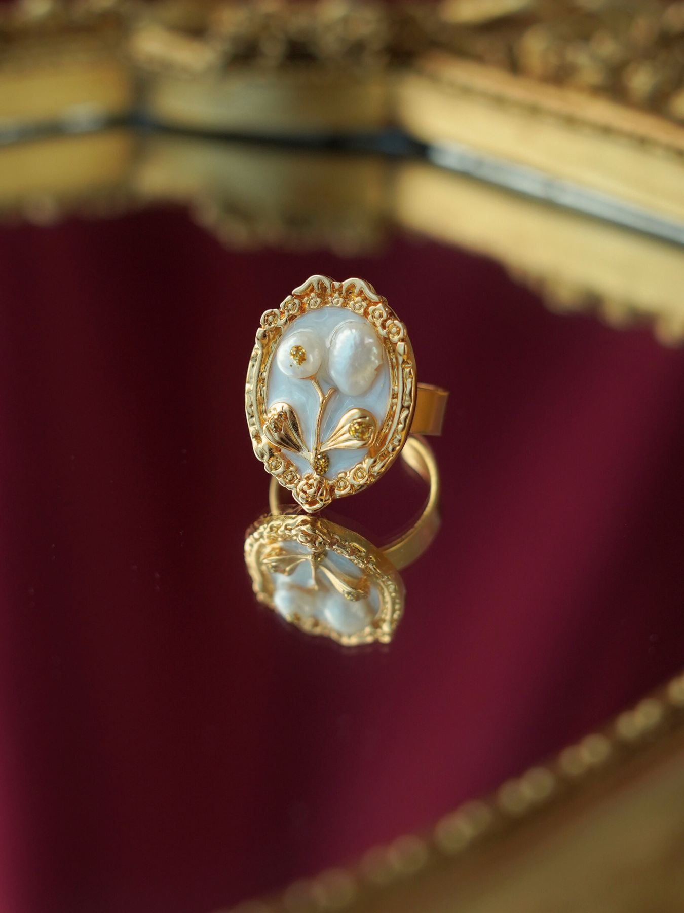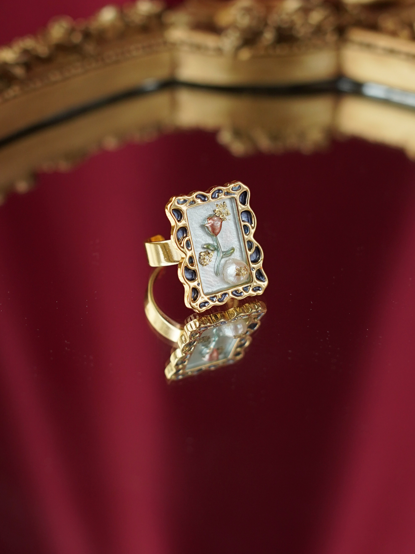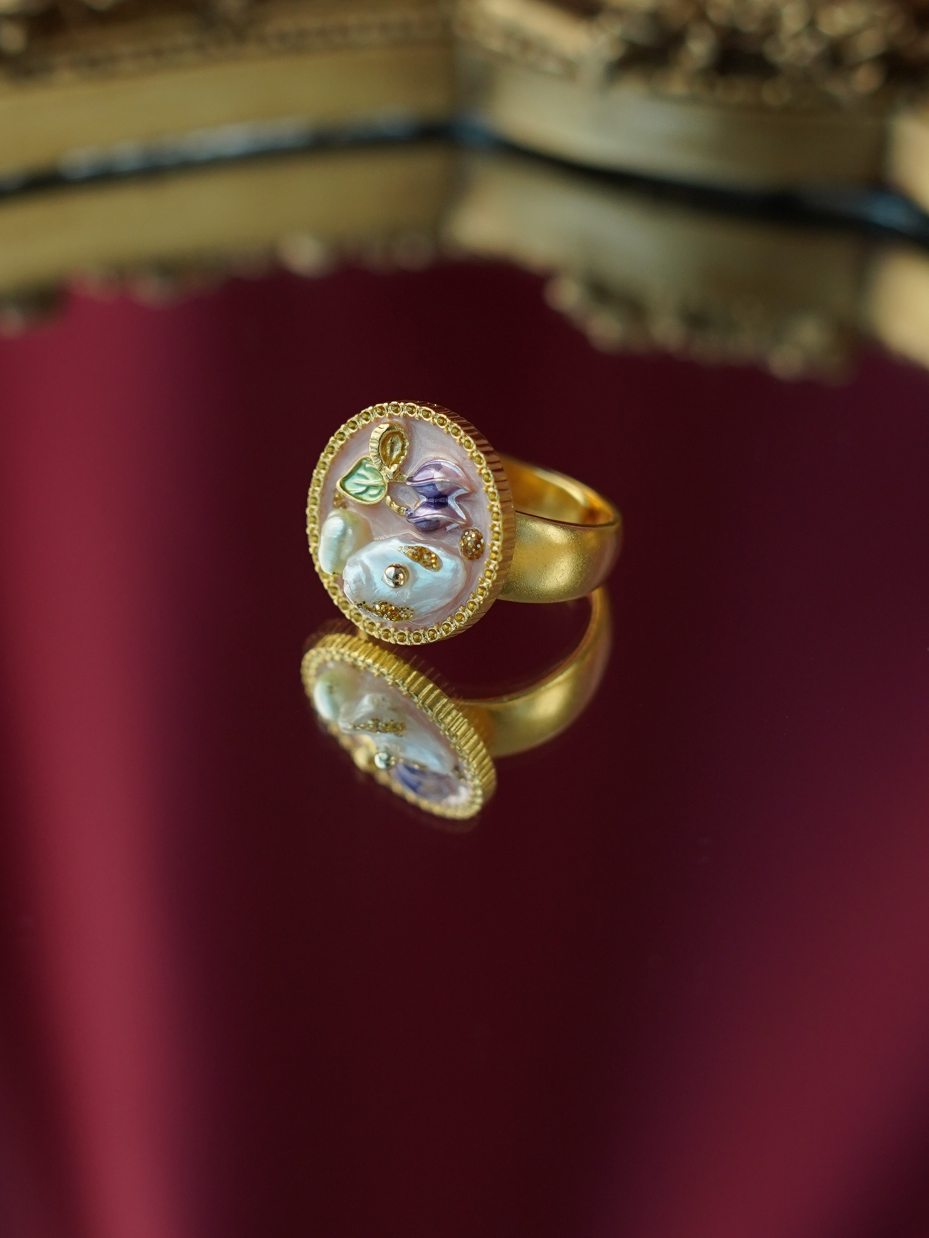 A perfect blend of elegance and artistry, this ring features a freshwater pearl set against delicate enamel detailing, finished with 14k gold plated hardware for a soft, luminous shine.