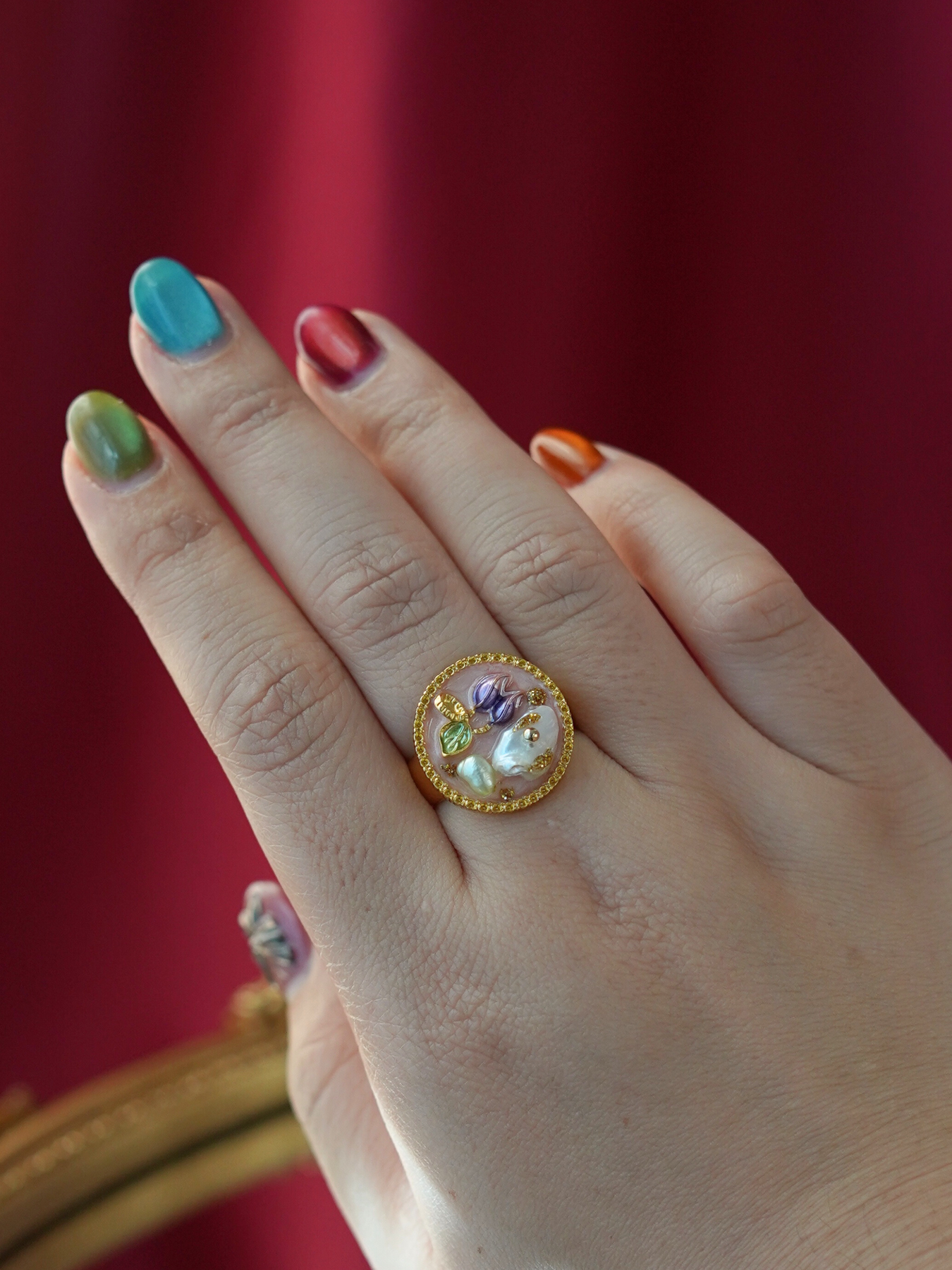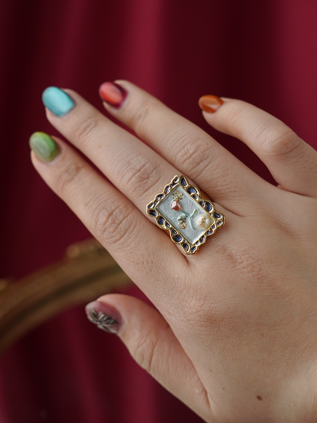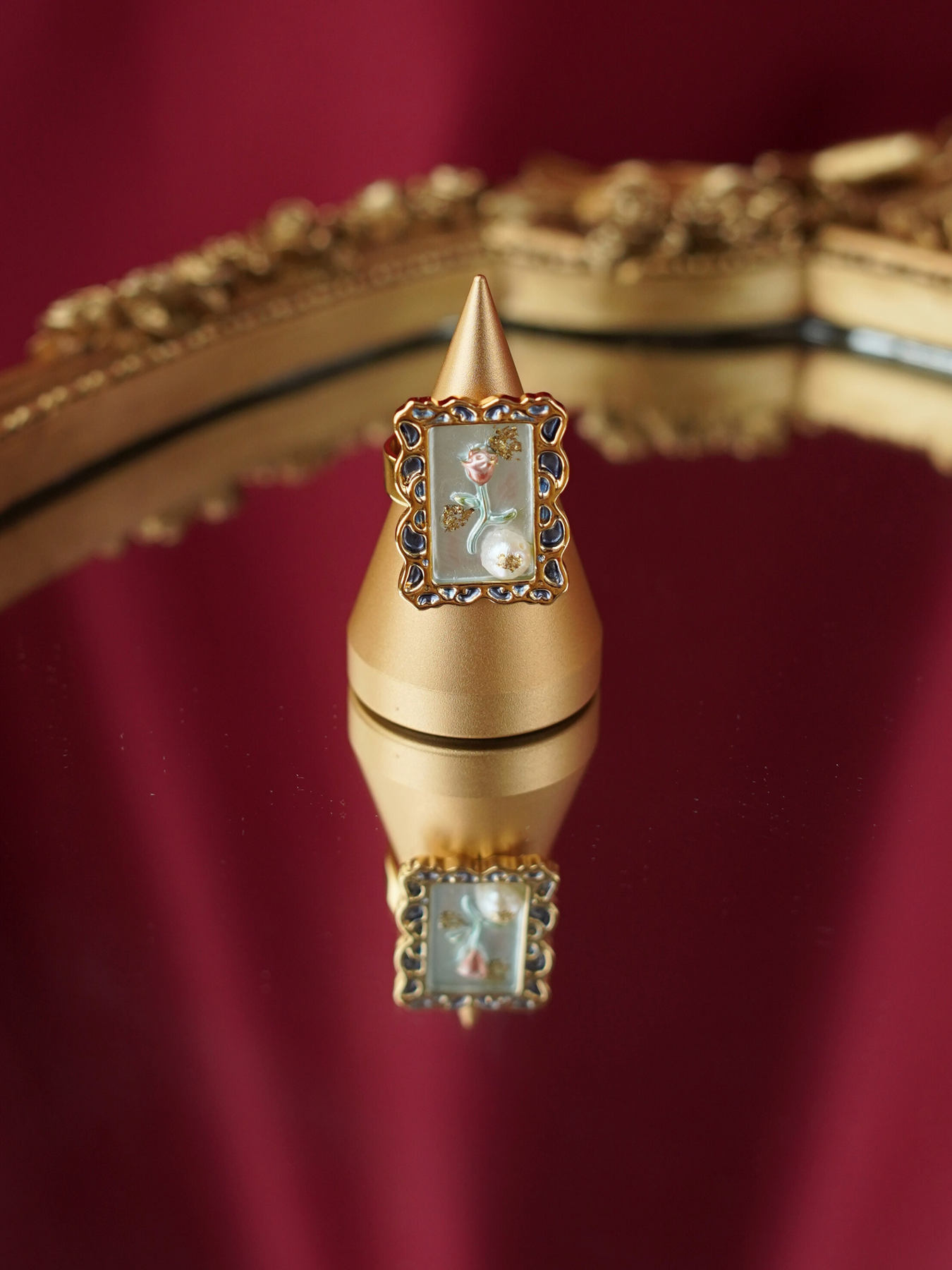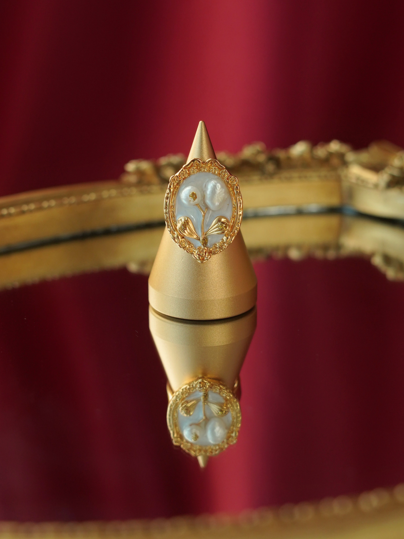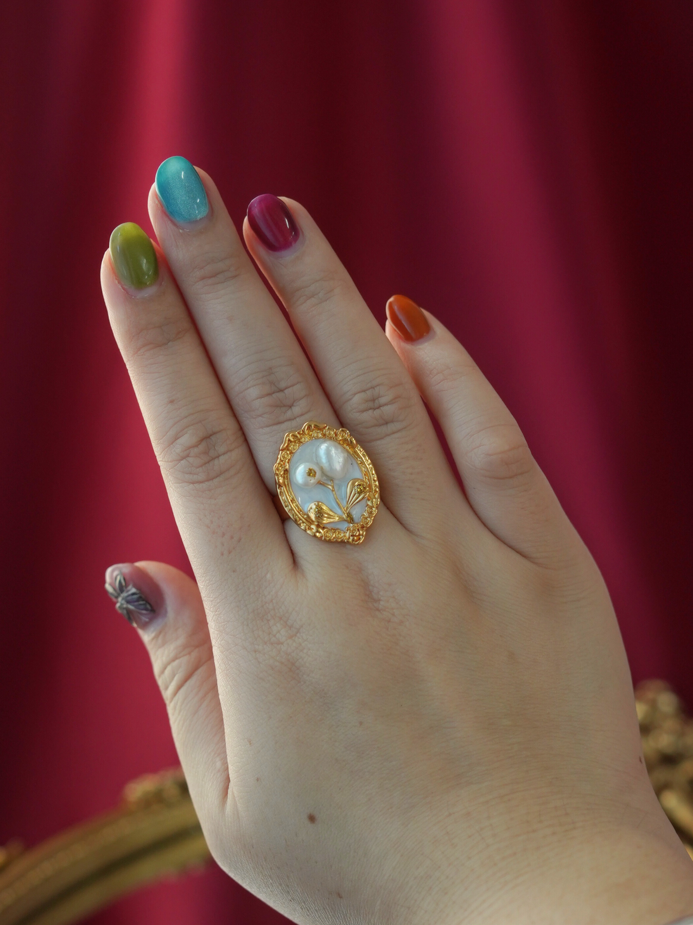 A perfect blend of elegance and artistry, this ring features a freshwater pearl set against delicate enamel detailing, finished with 14k gold plated hardware for a soft, luminous shine.