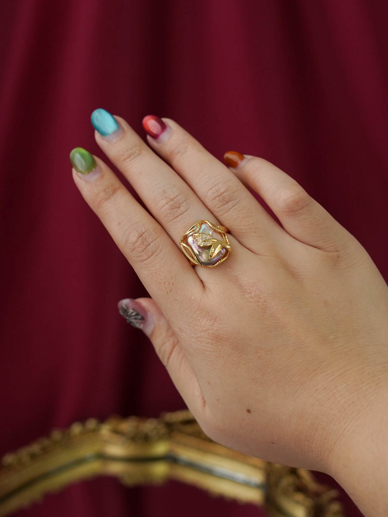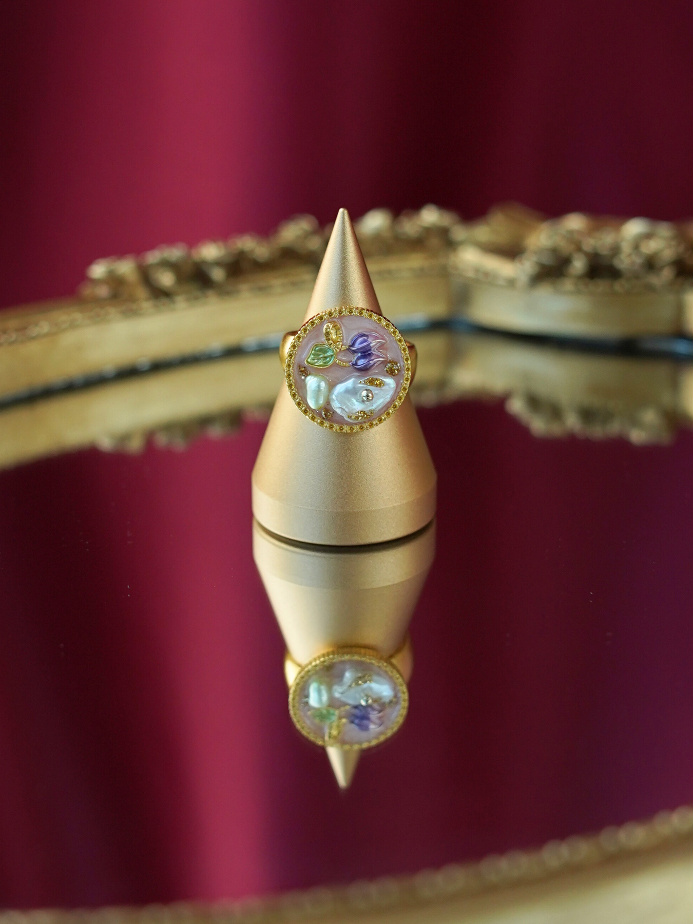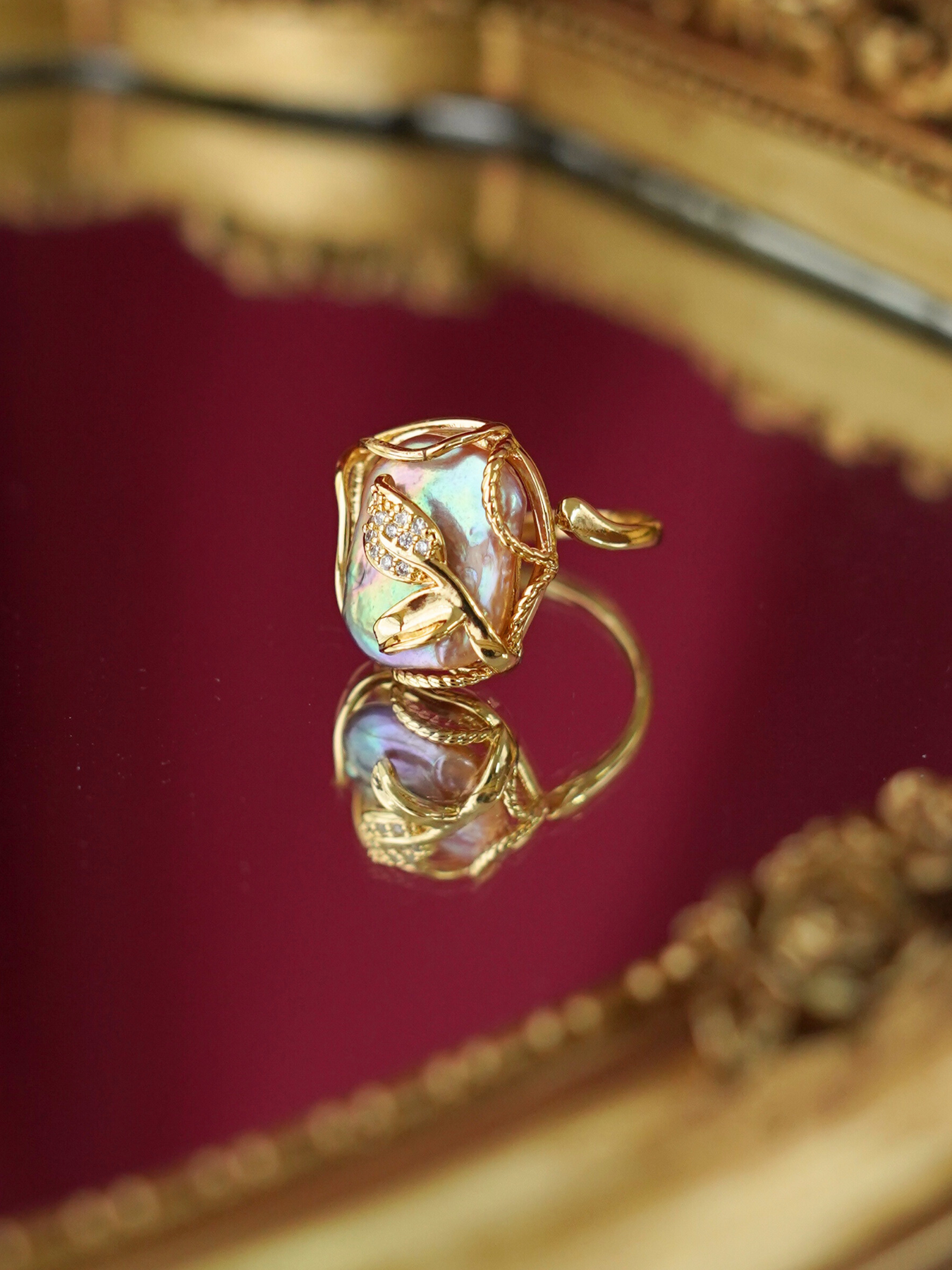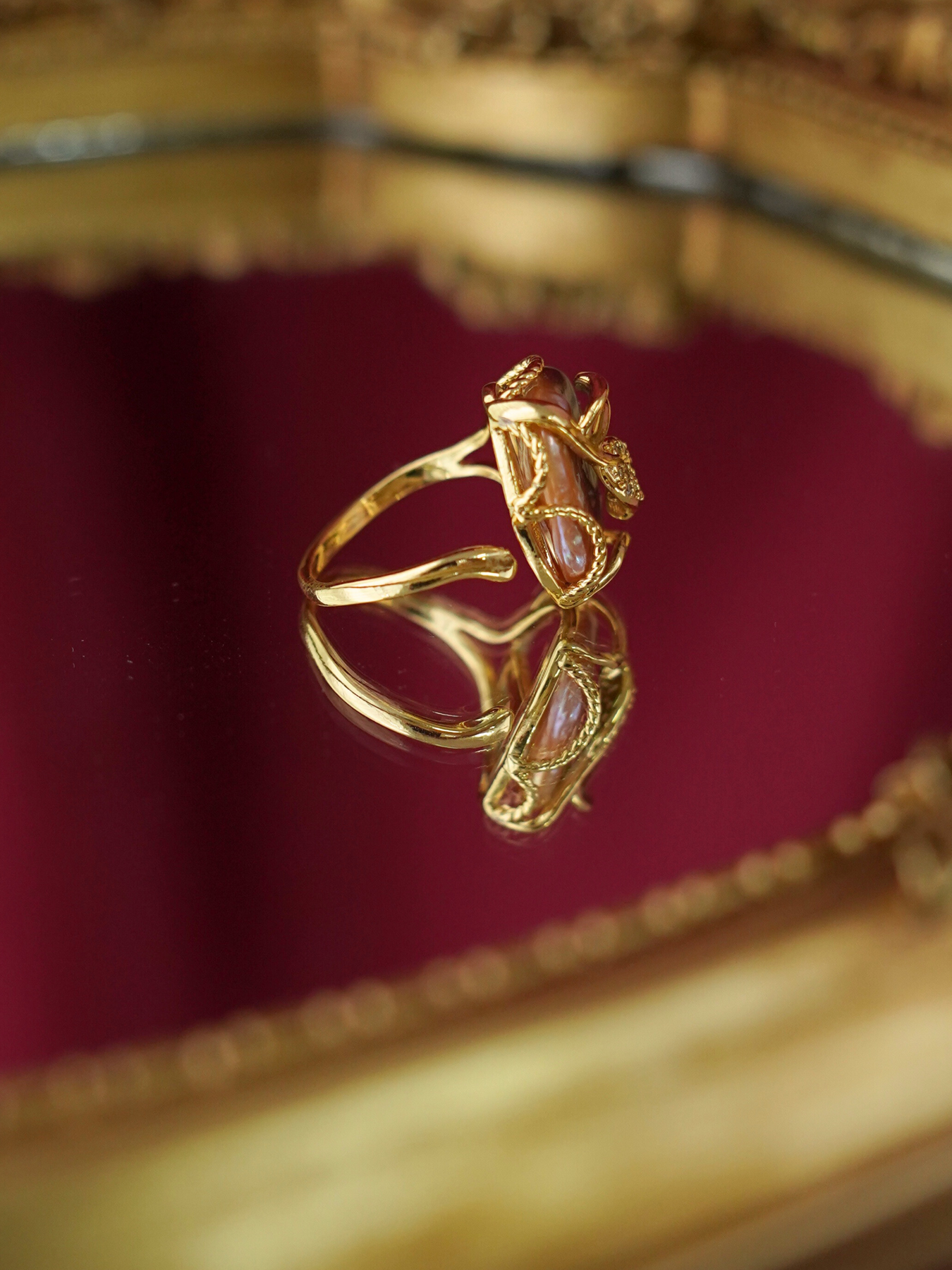 A perfect blend of elegance and artistry, this ring features a freshwater pearl set against delicate enamel detailing, finished with 14k gold plated hardware for a soft, luminous shine.