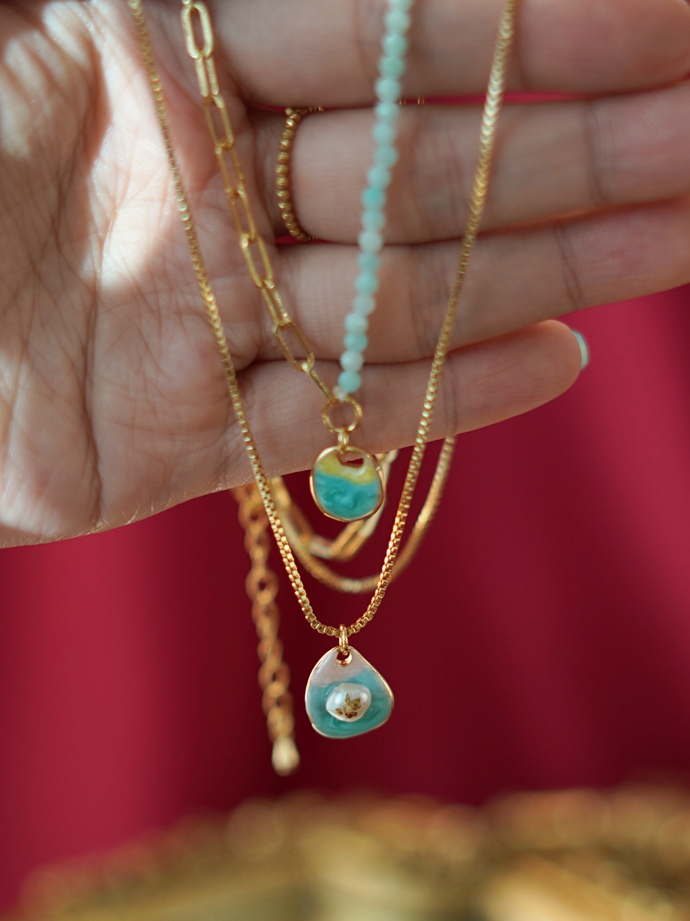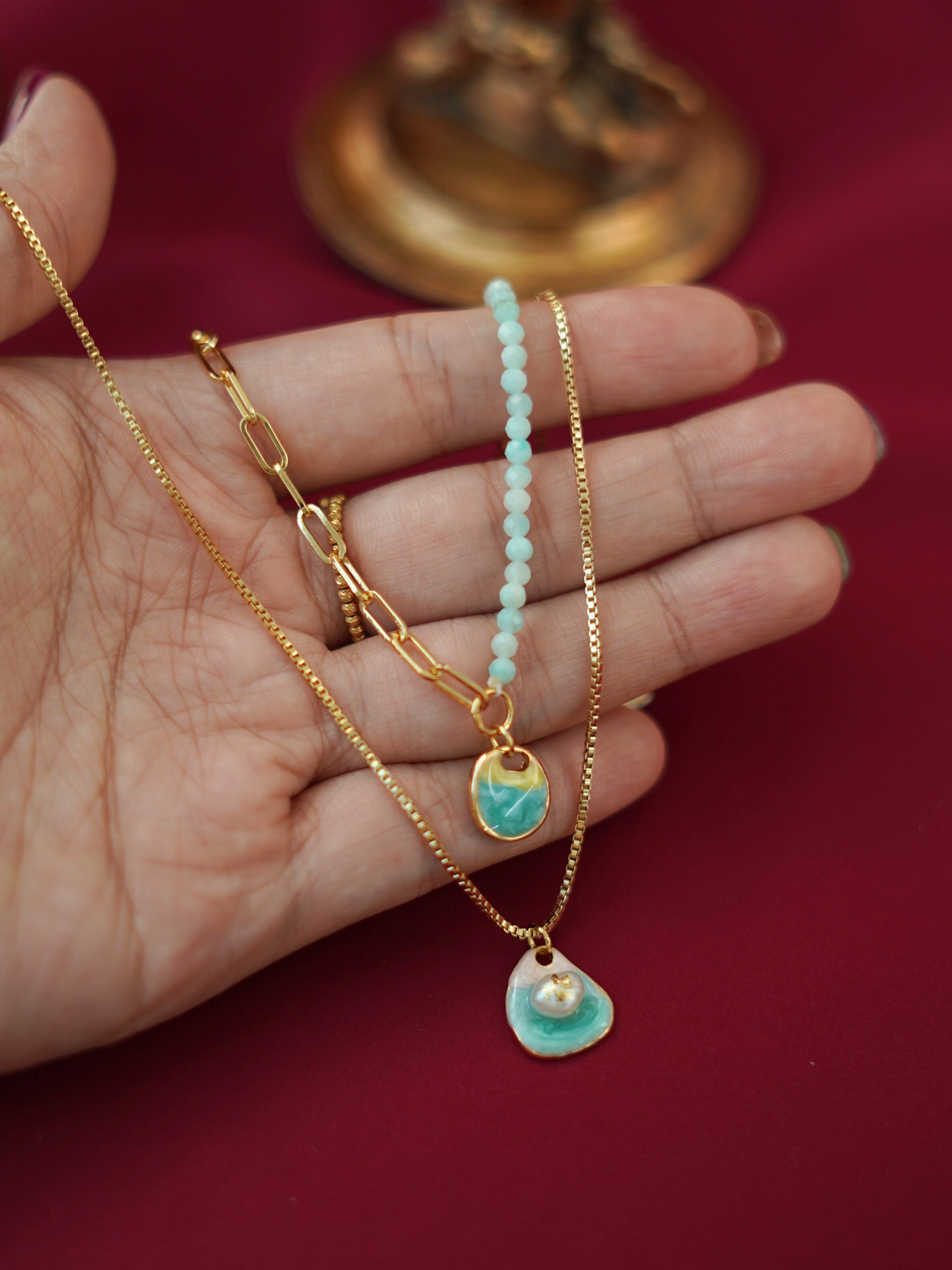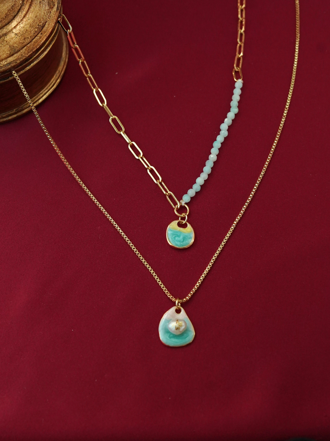 Soft, feminine, and quietly luxurious — this double-layer necklace brings together delicate 14k gold plated chains with a beautifully crafted enamel pendant accented by freshwater pearls. Each natural pearl has its own subtle variations, giving the piece an organic charm that feels personal and truly unique.