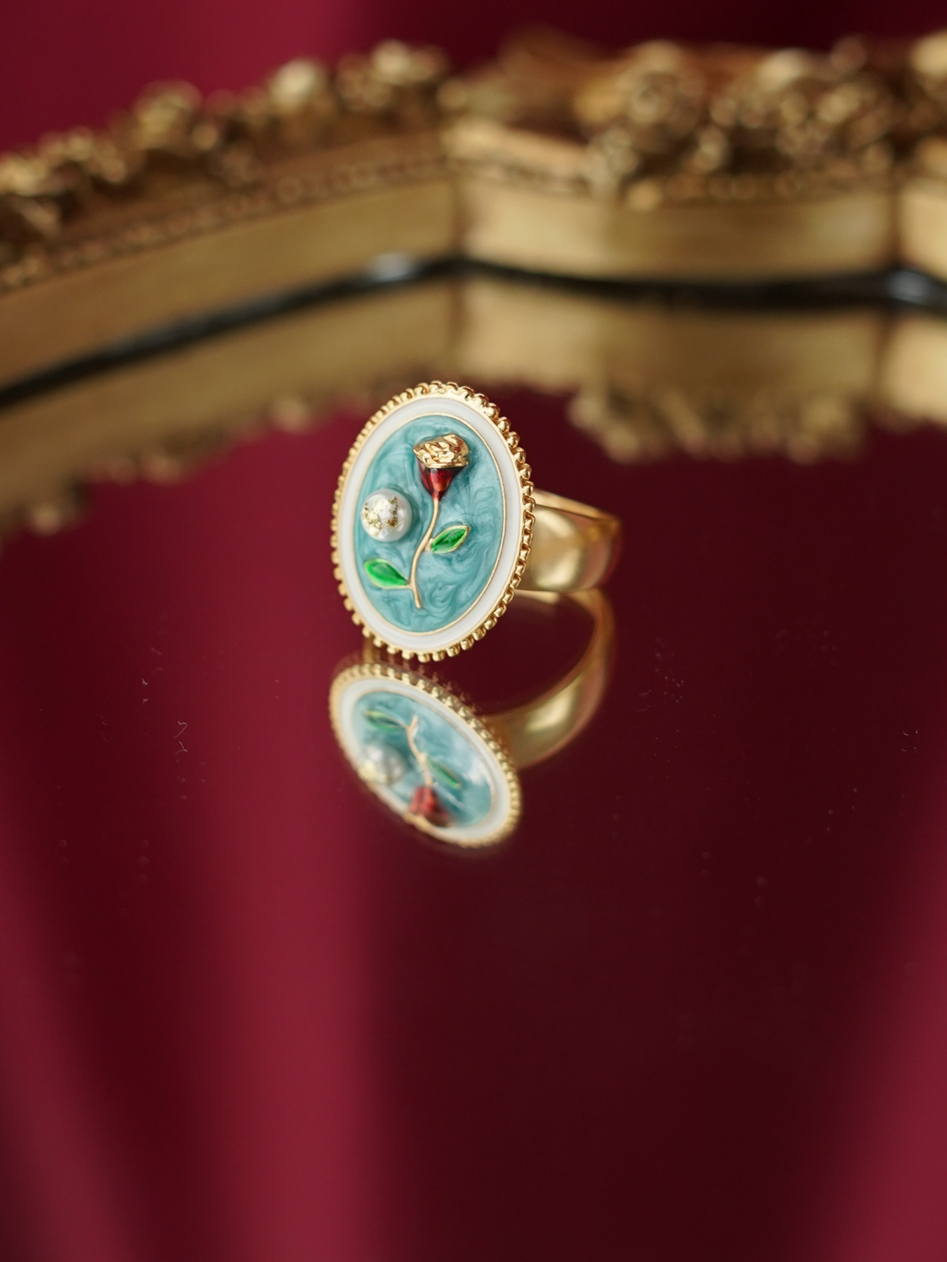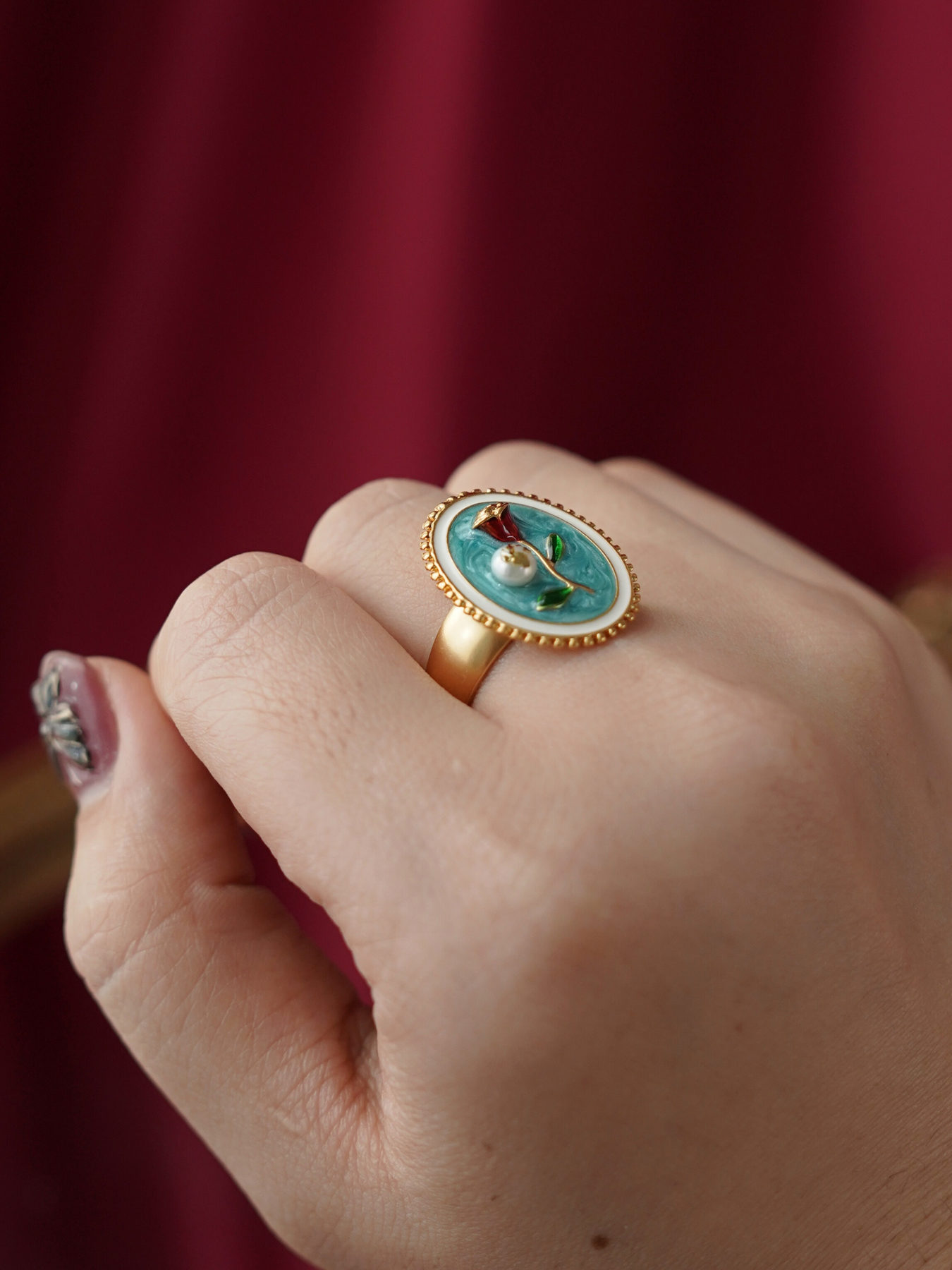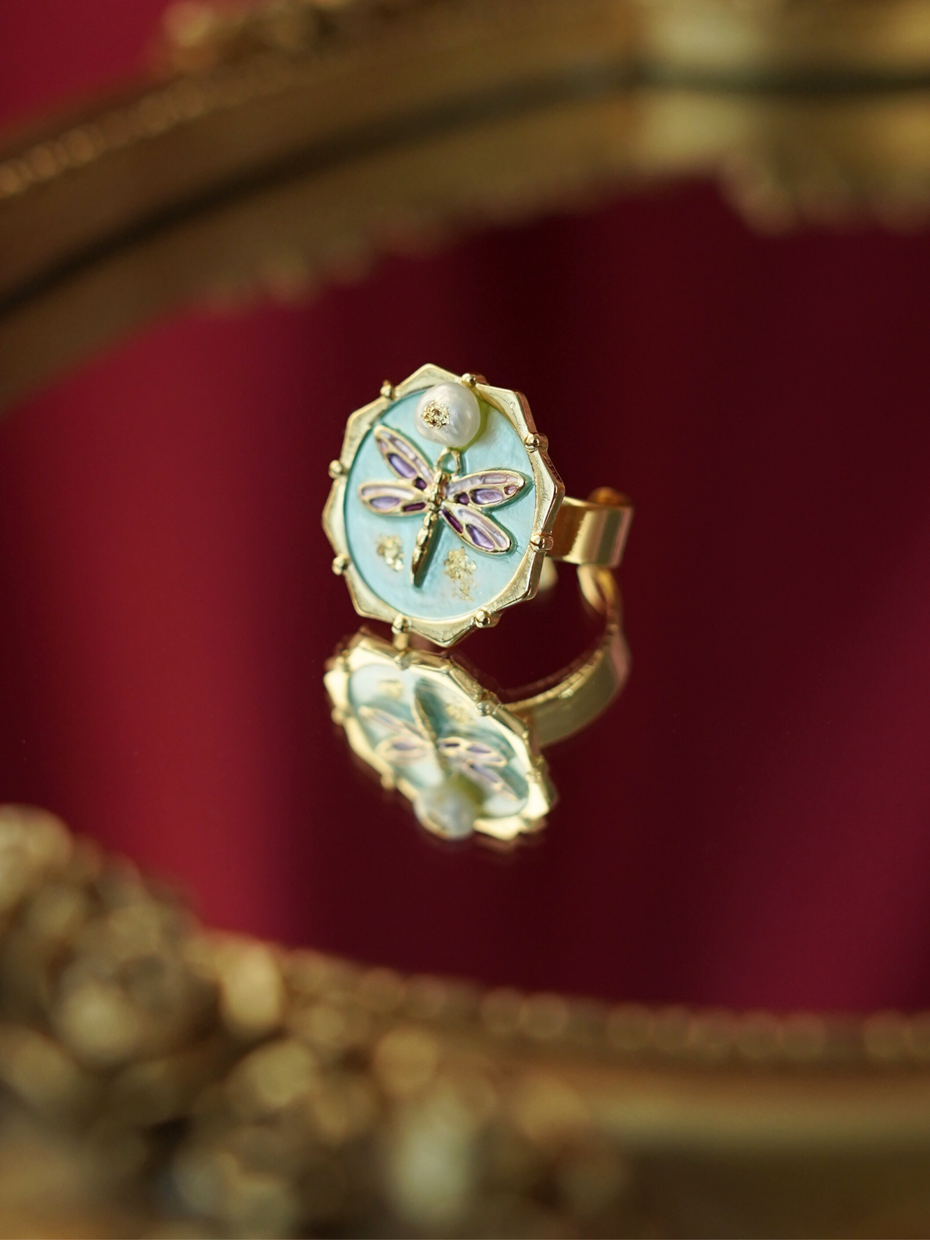 A perfect blend of elegance and artistry, this ring features a freshwater pearl set against delicate enamel detailing, finished with 14k gold plated hardware for a soft, luminous shine.