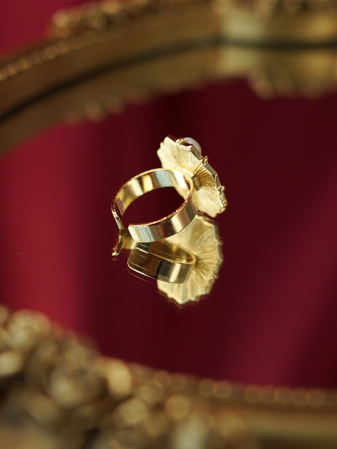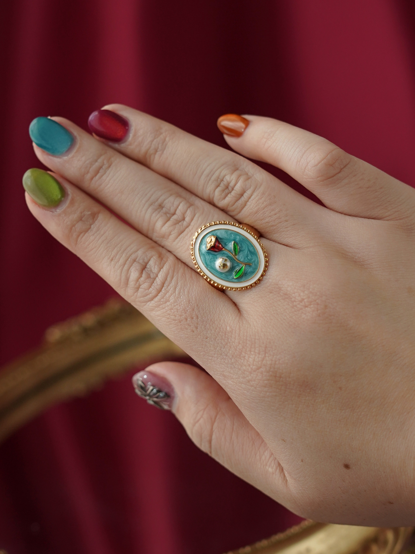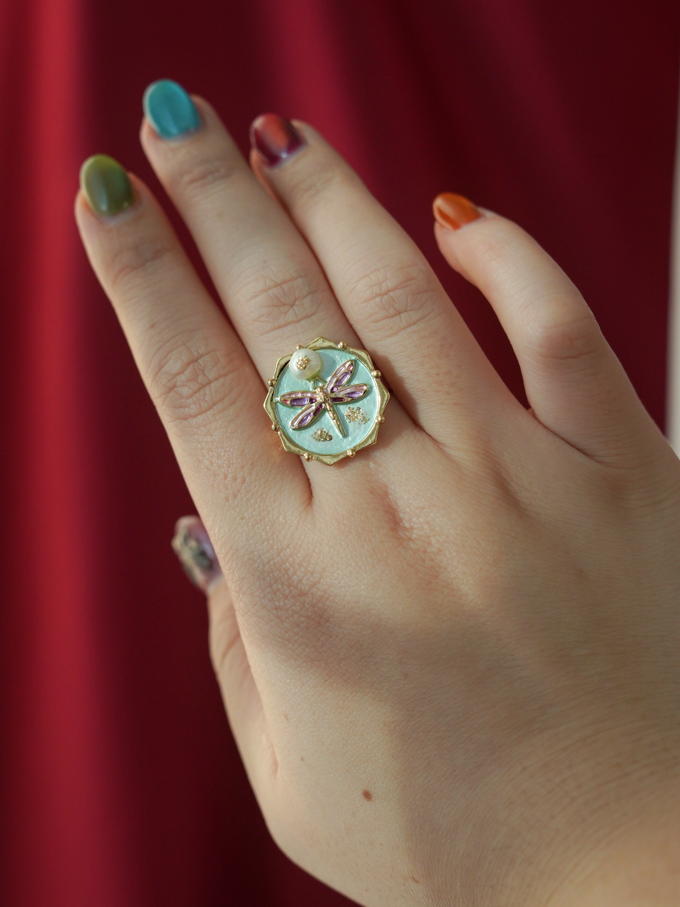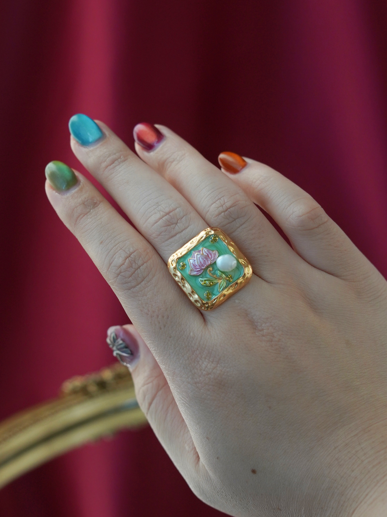 A perfect blend of elegance and artistry, this ring features a freshwater pearl set against delicate enamel detailing, finished with 14k gold plated hardware for a soft, luminous shine.
