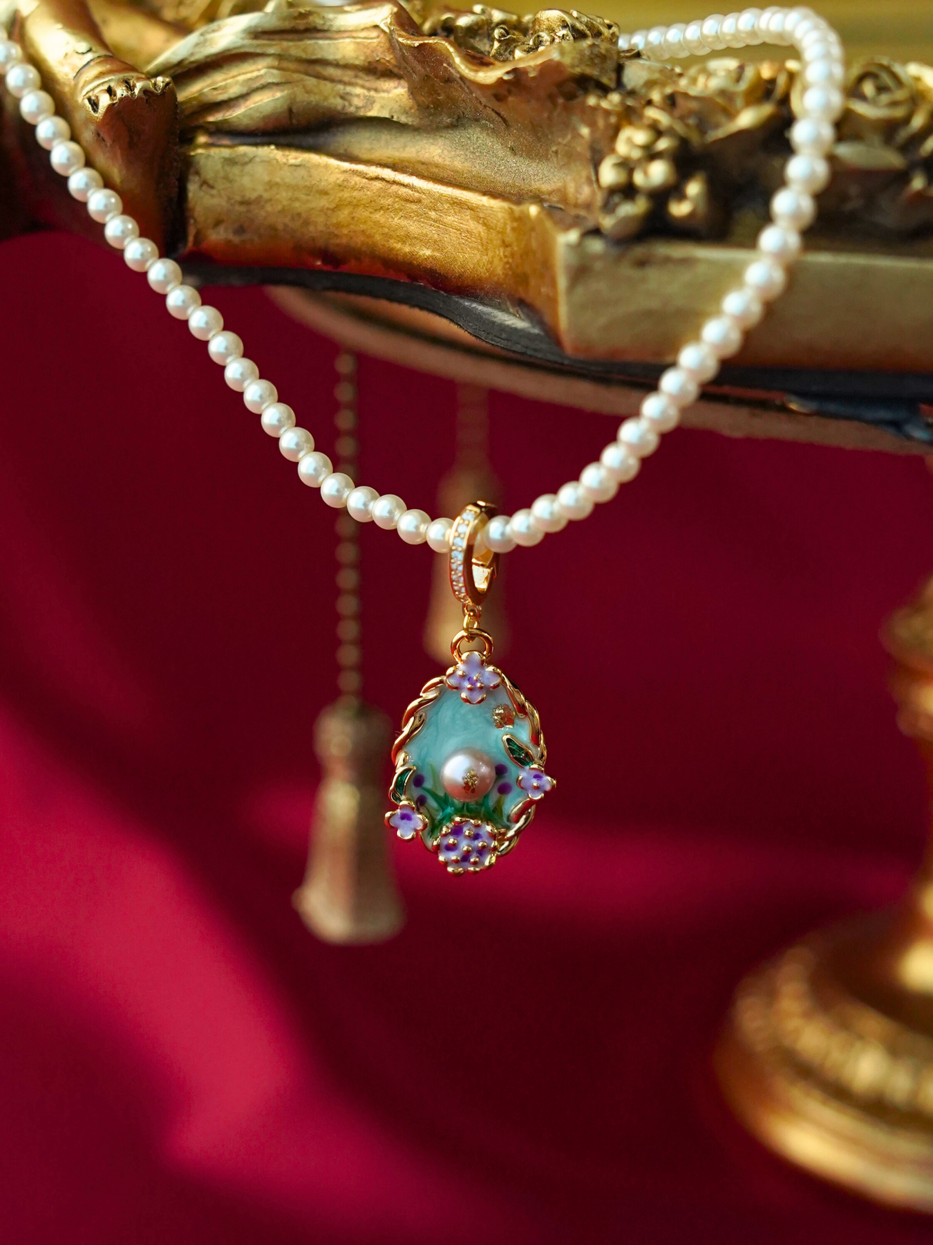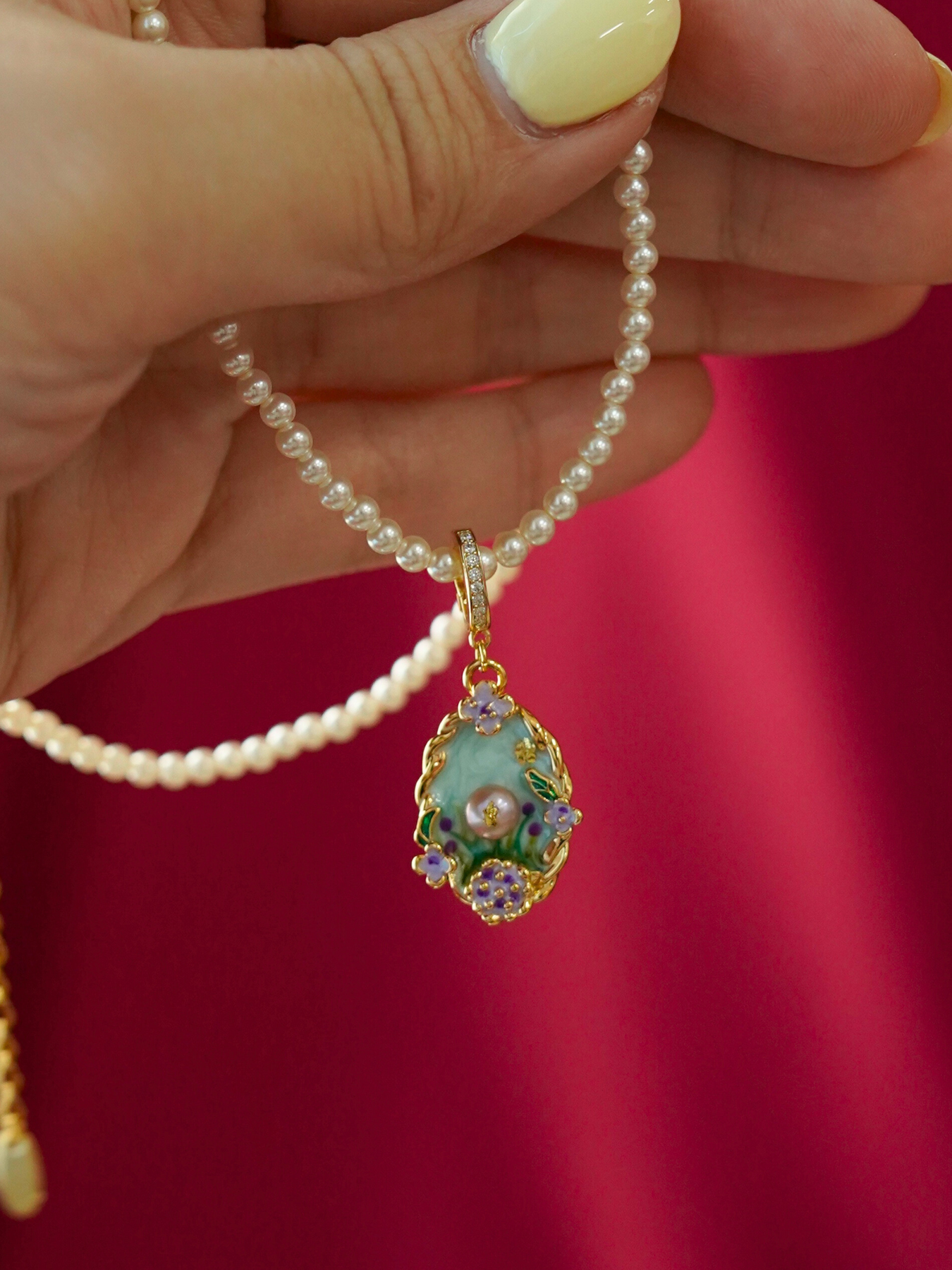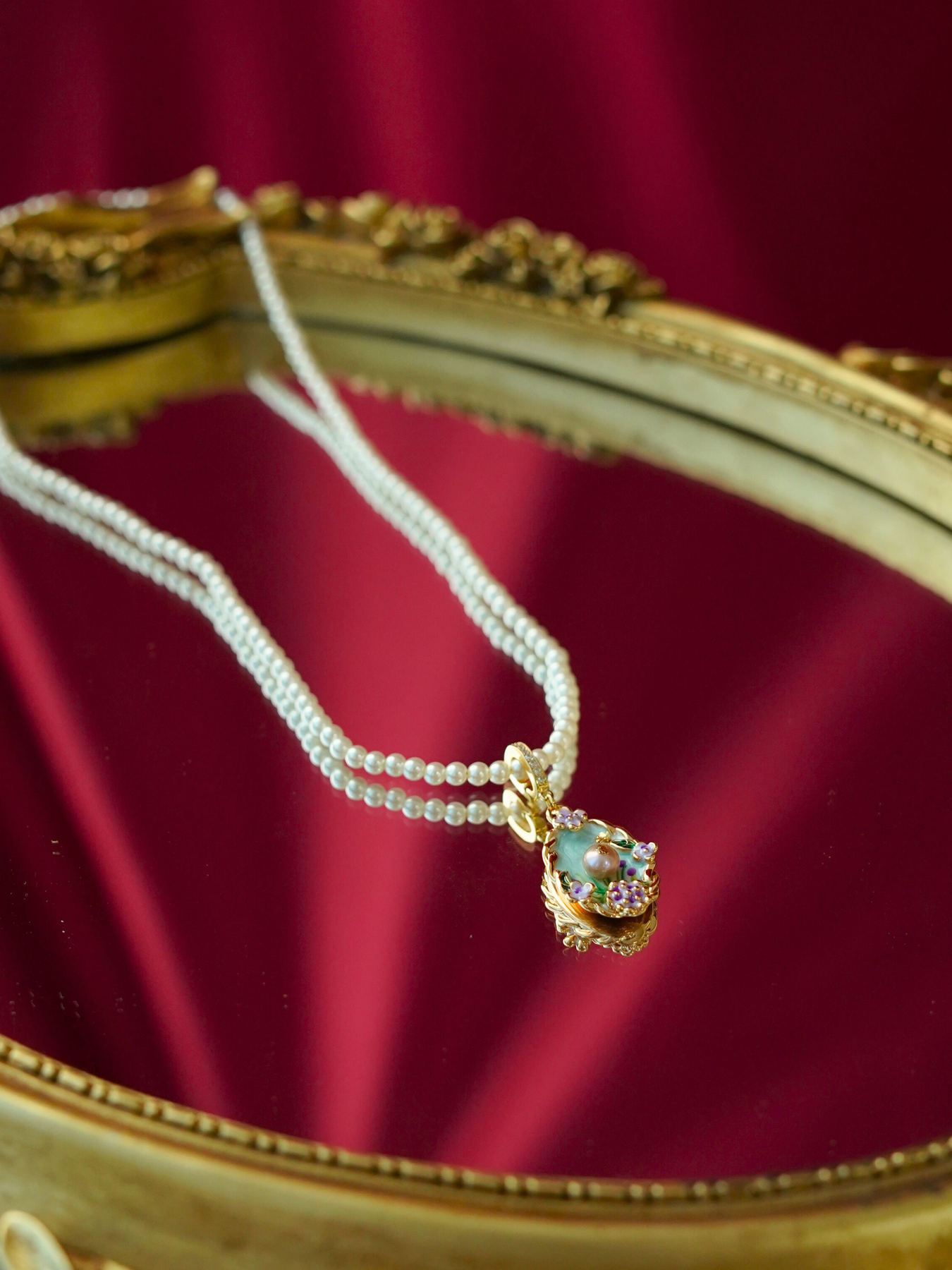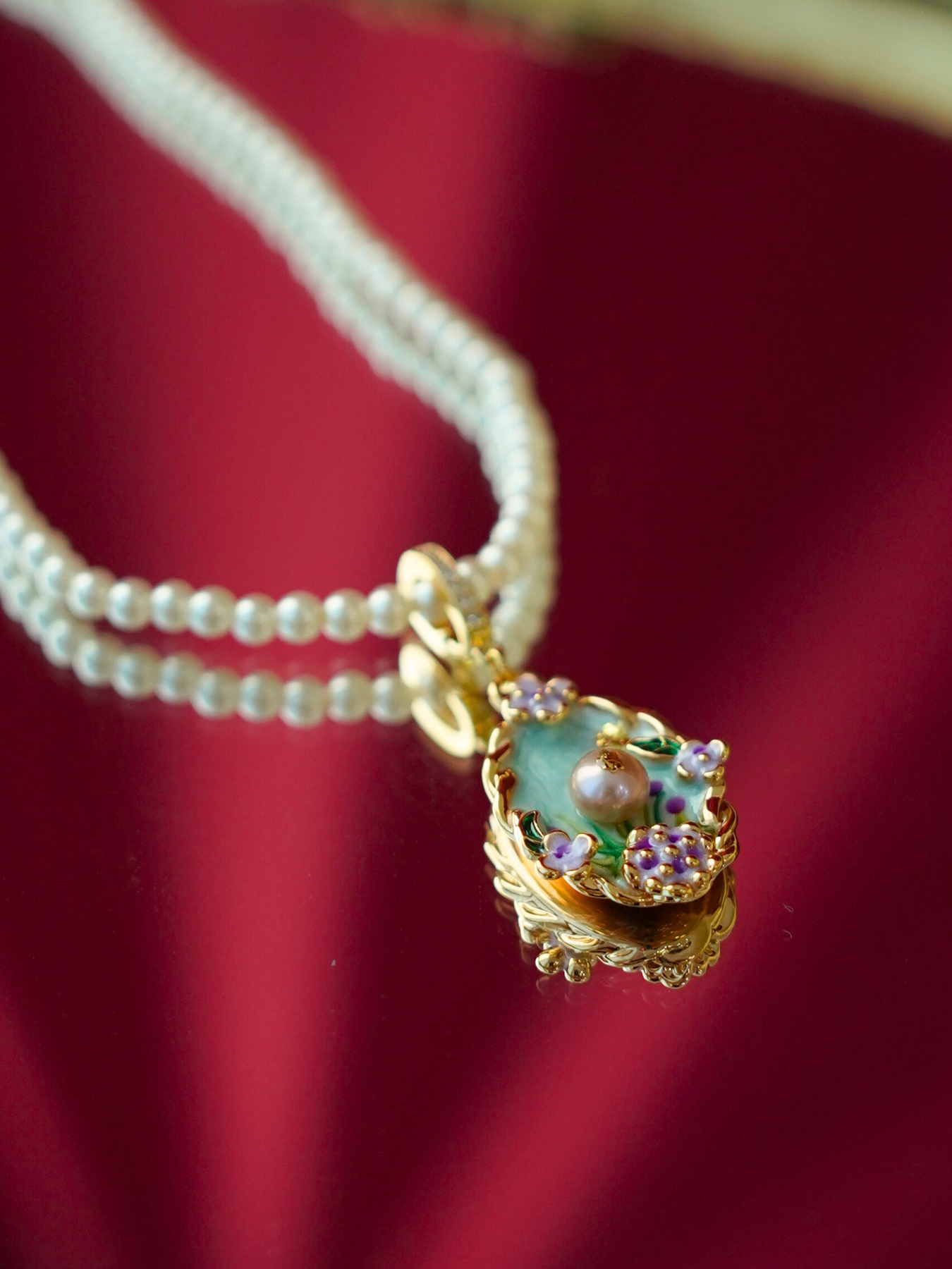 • Detailing: full pearls necklace & enamel