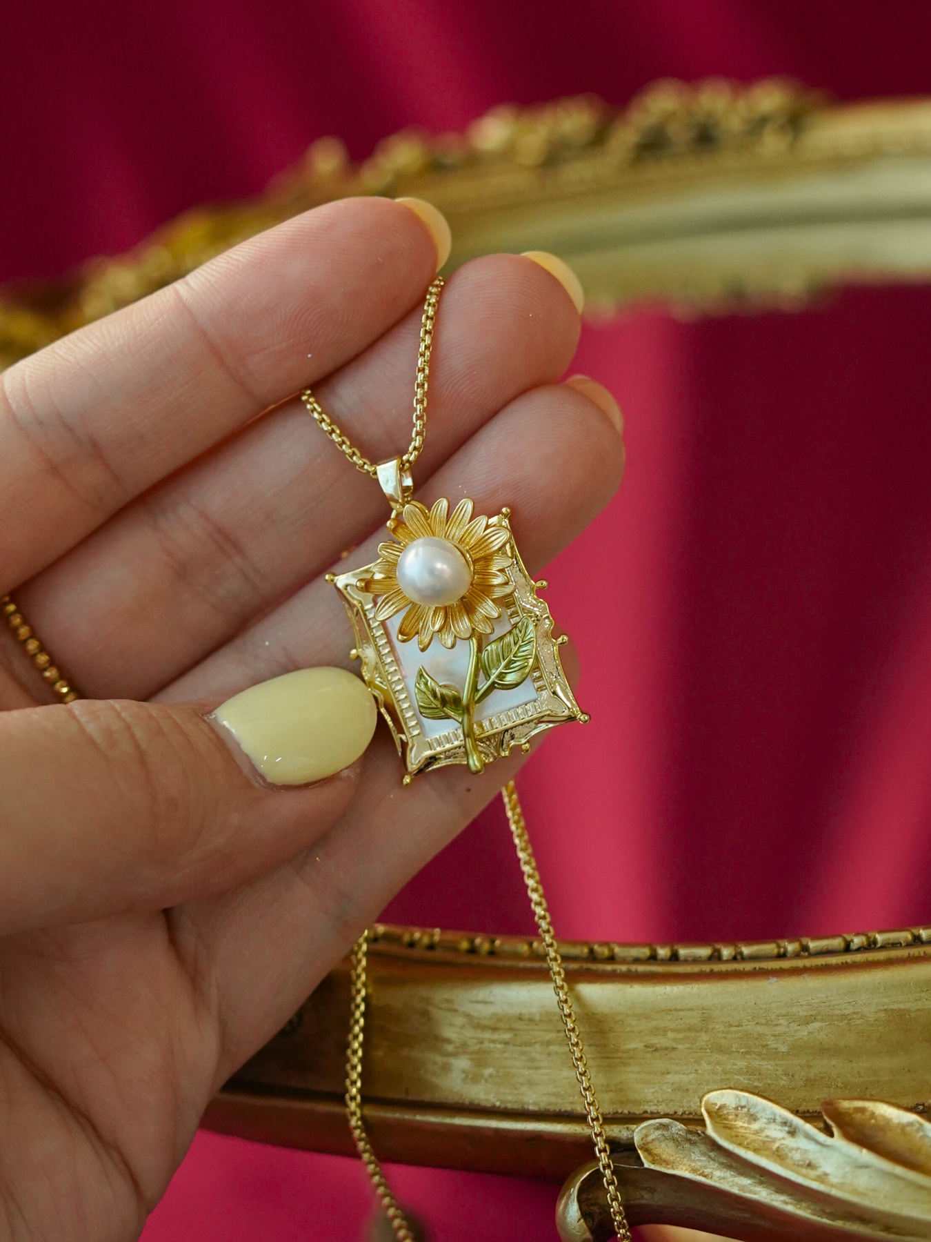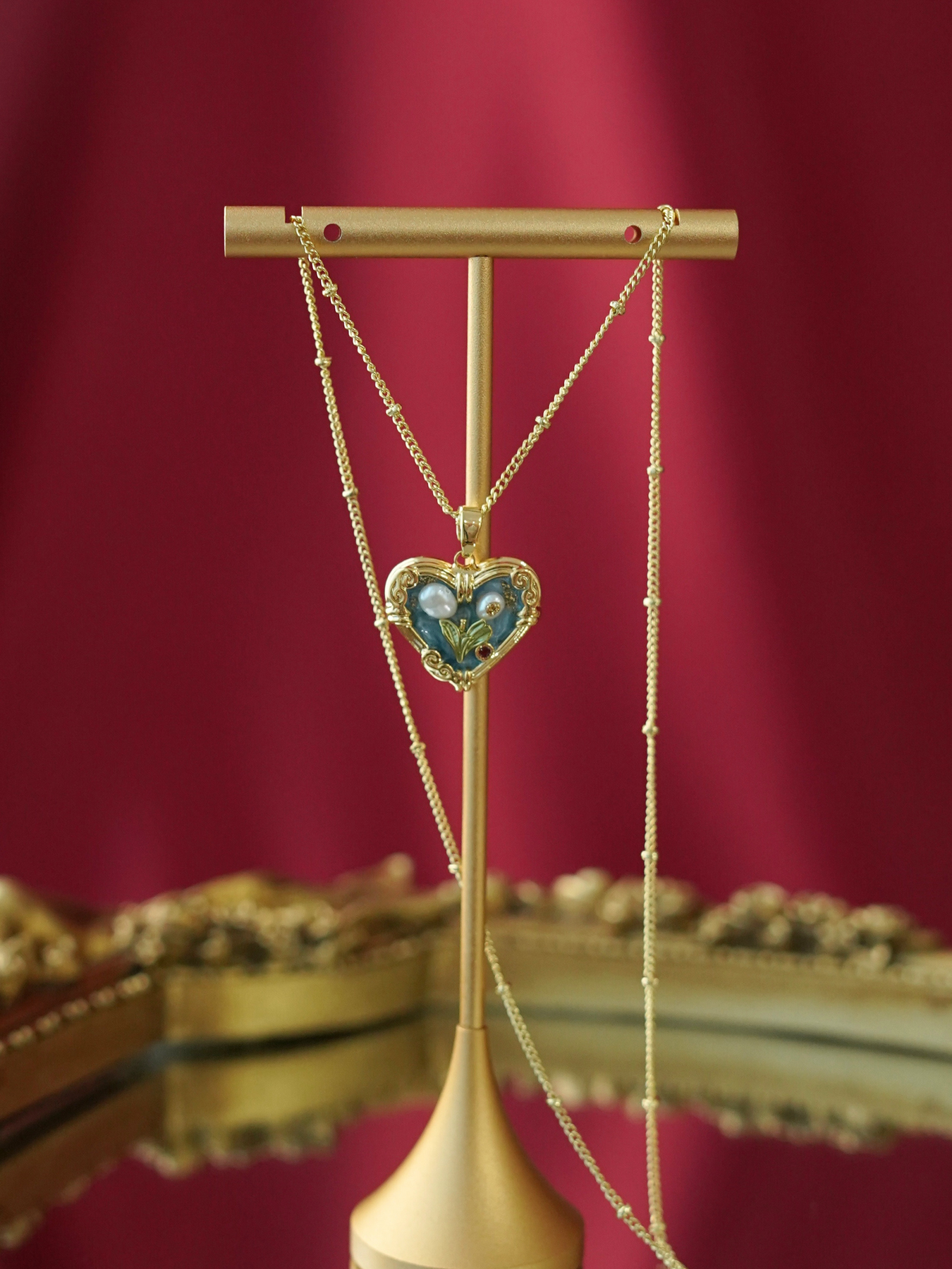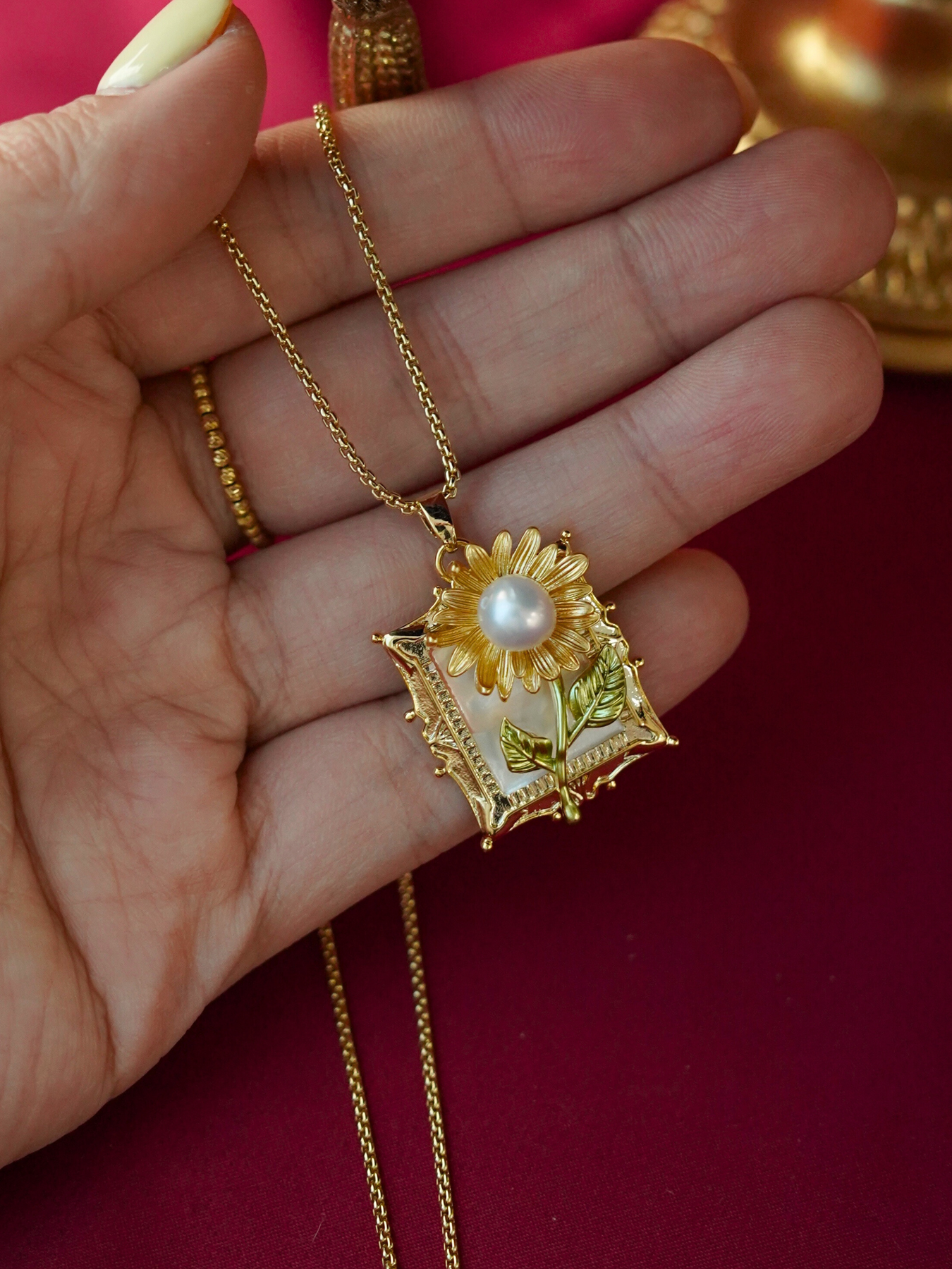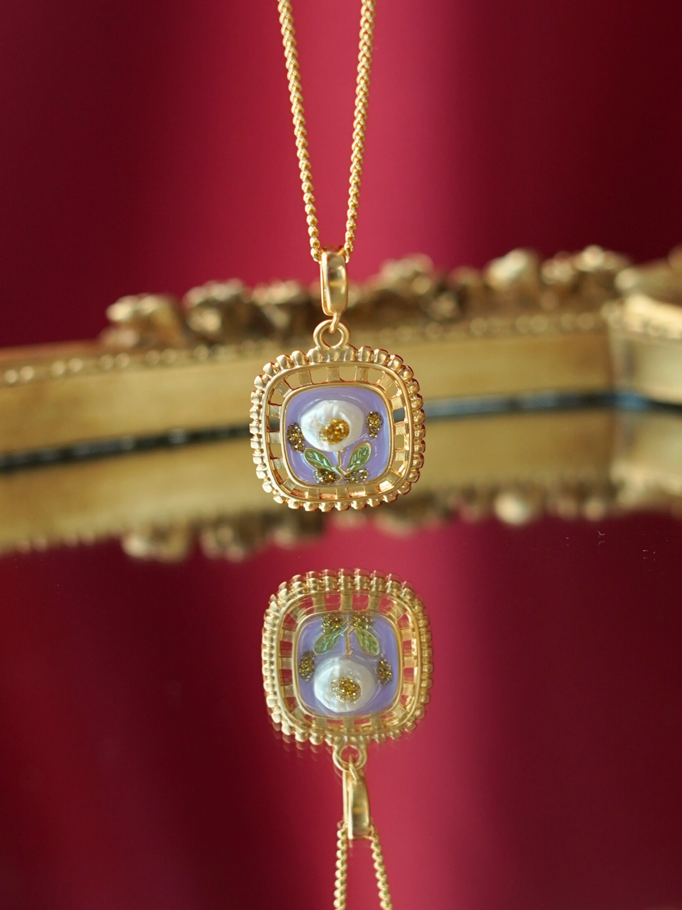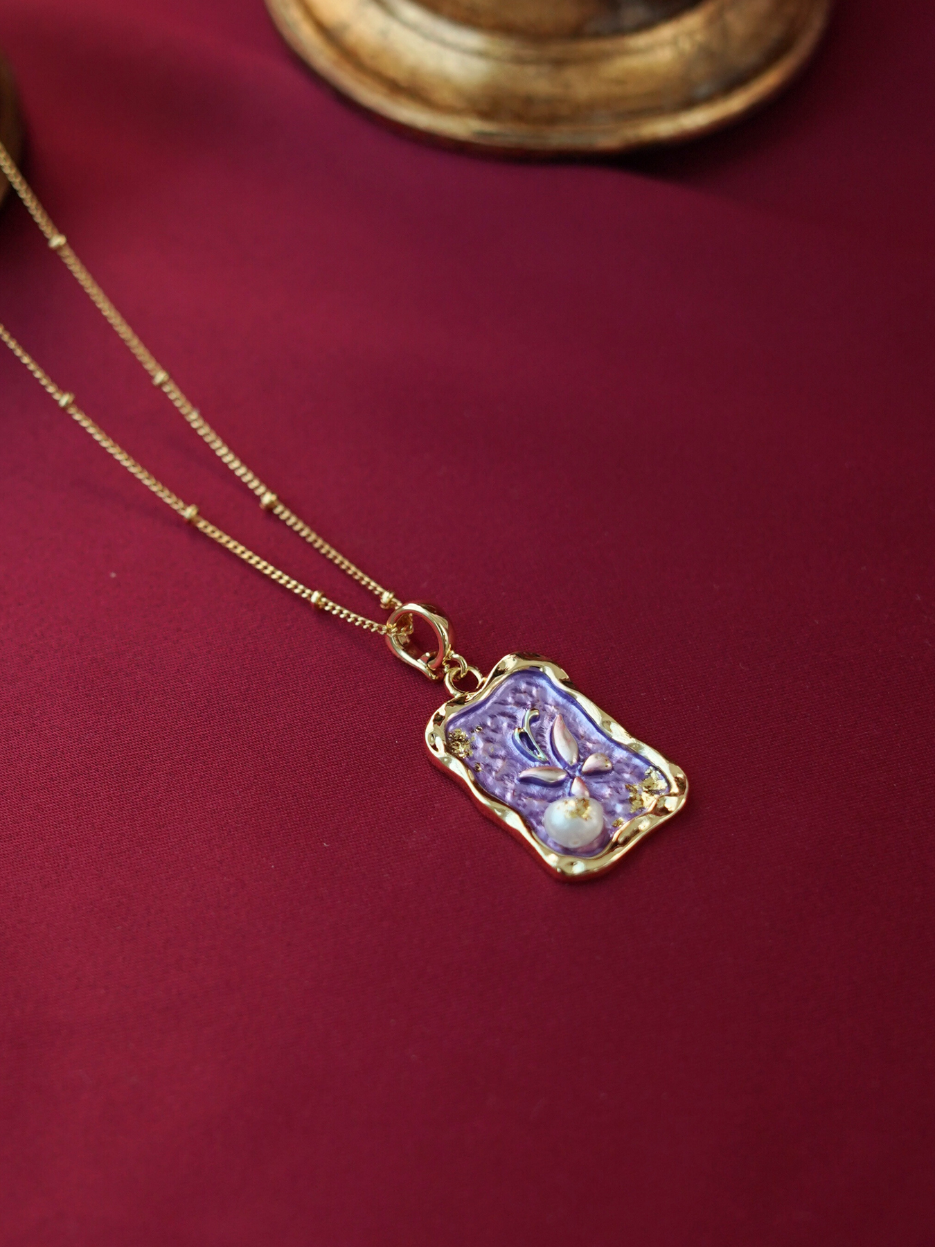 • Detailing: full pearls necklace & enamel