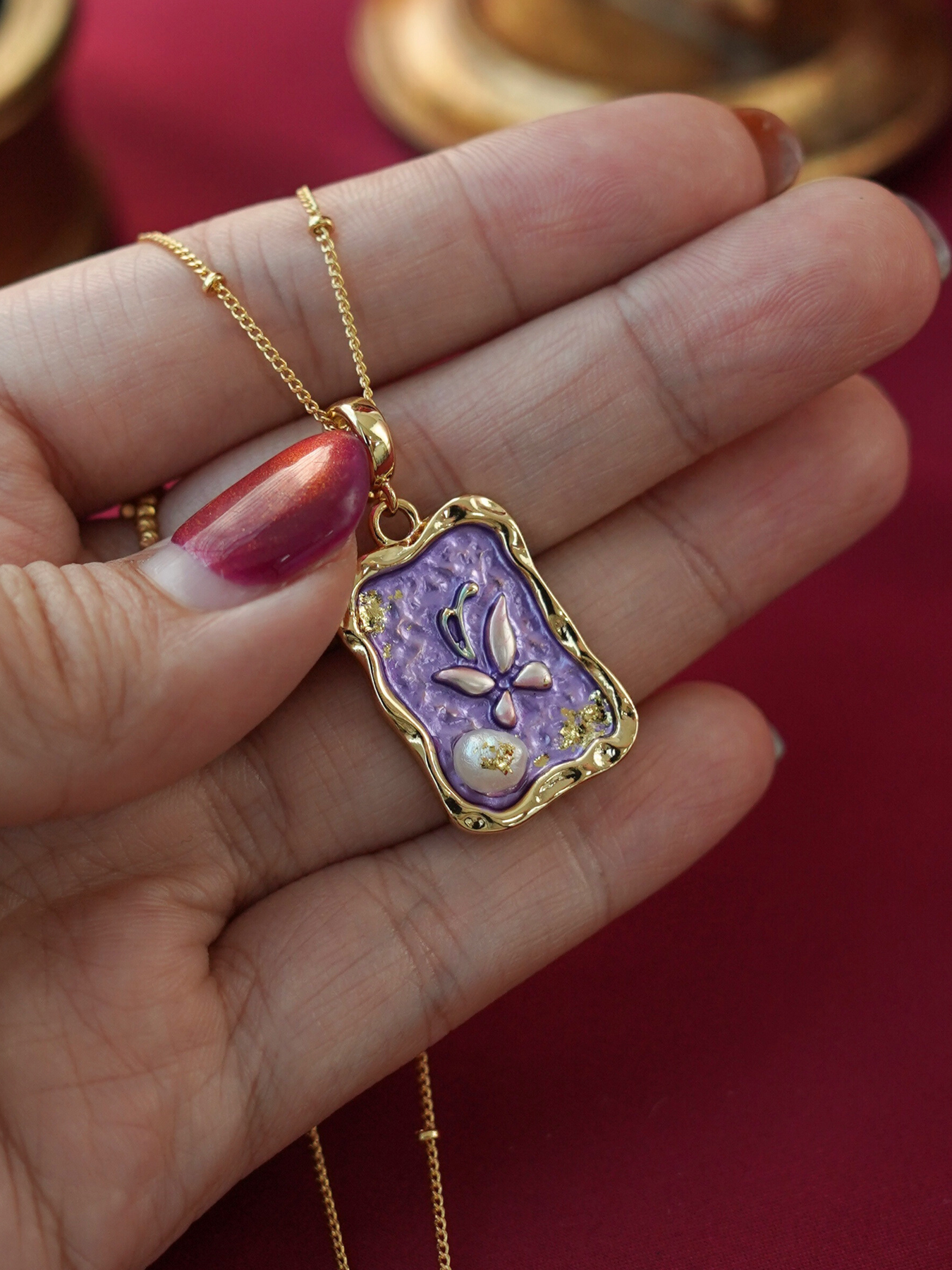 This necklace features a beautifully coated enamel centrepiece, paired with delicate freshwater pearls and finished in 14k gold plating for a soft, refined glow. Lightweight, feminine, and effortlessly charming — it’s the perfect everyday piece that adds a hint of personality without losing its classic allure.