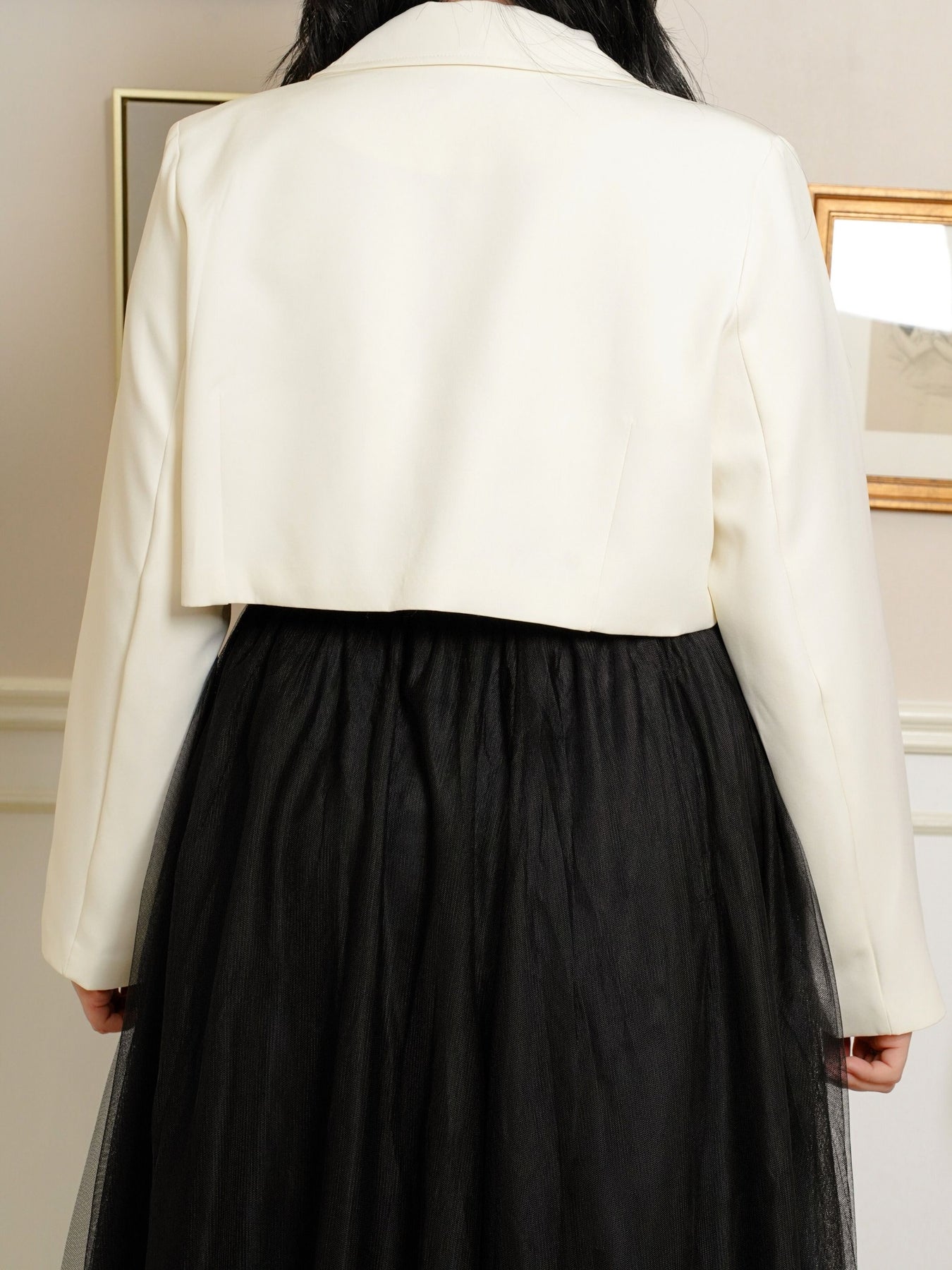 Lapel collar, crop design and fully lined.