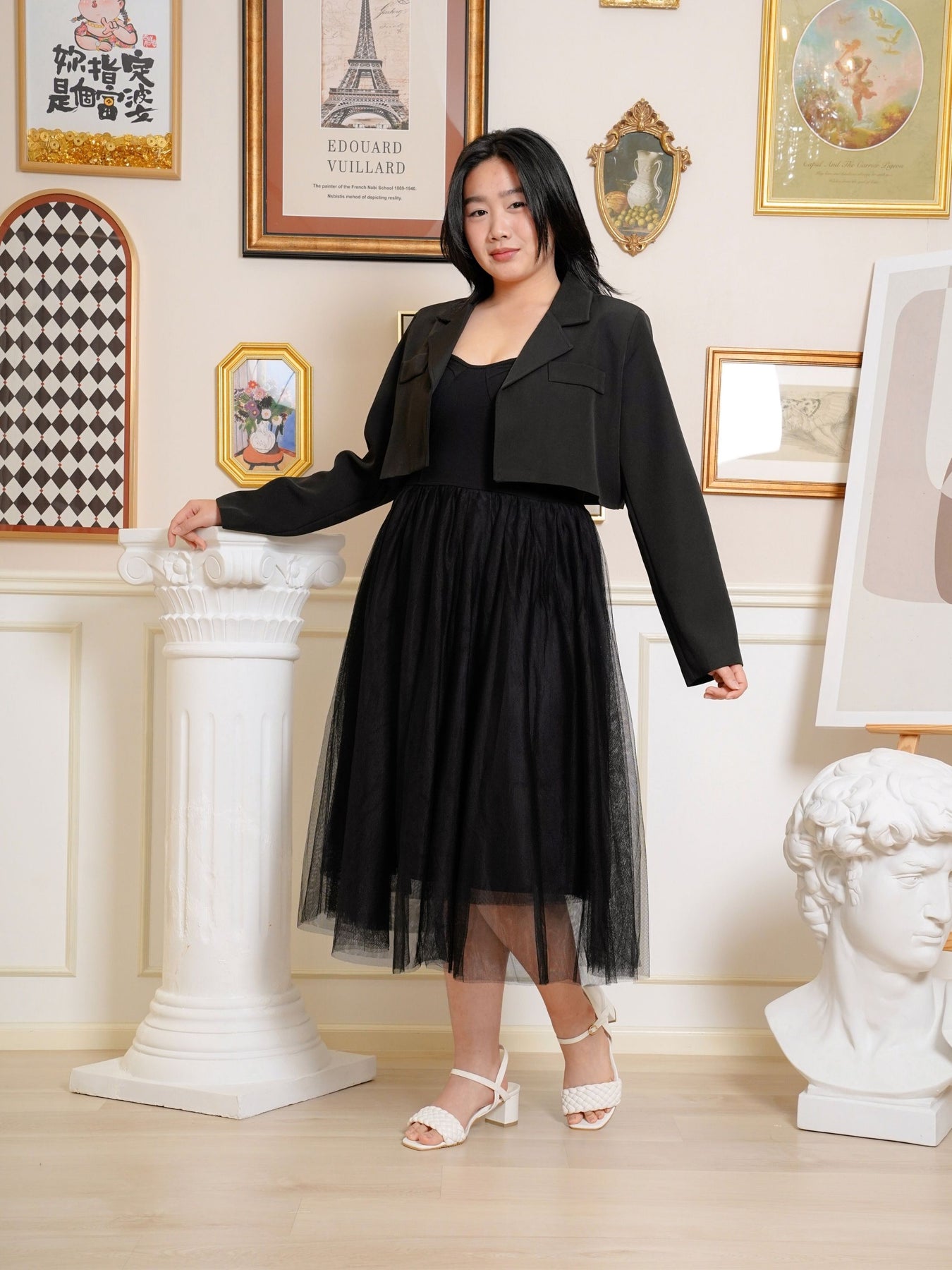 Model (wearing white and black) wears SIZE 2.