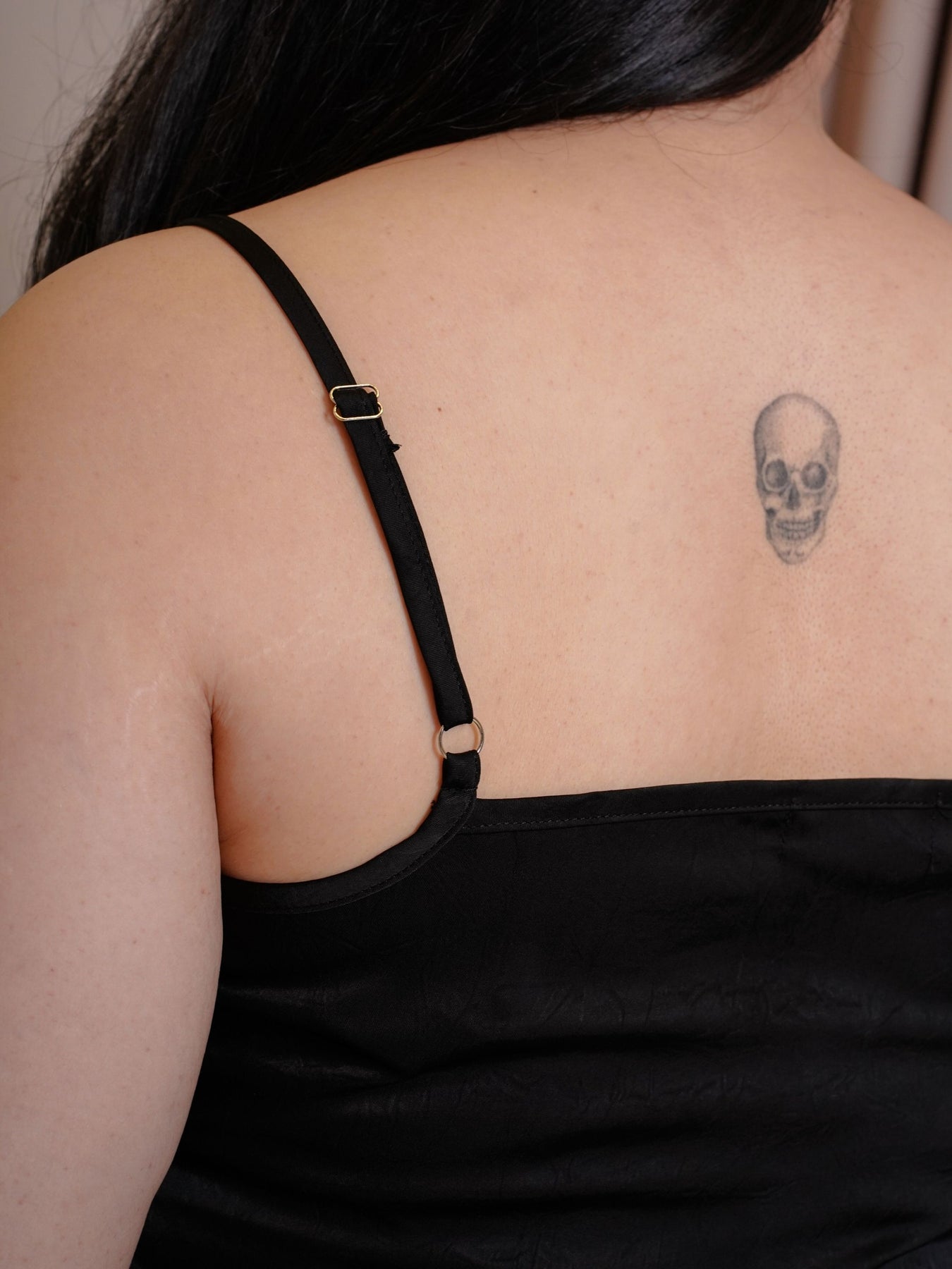 V neckline and adjustable strap.
