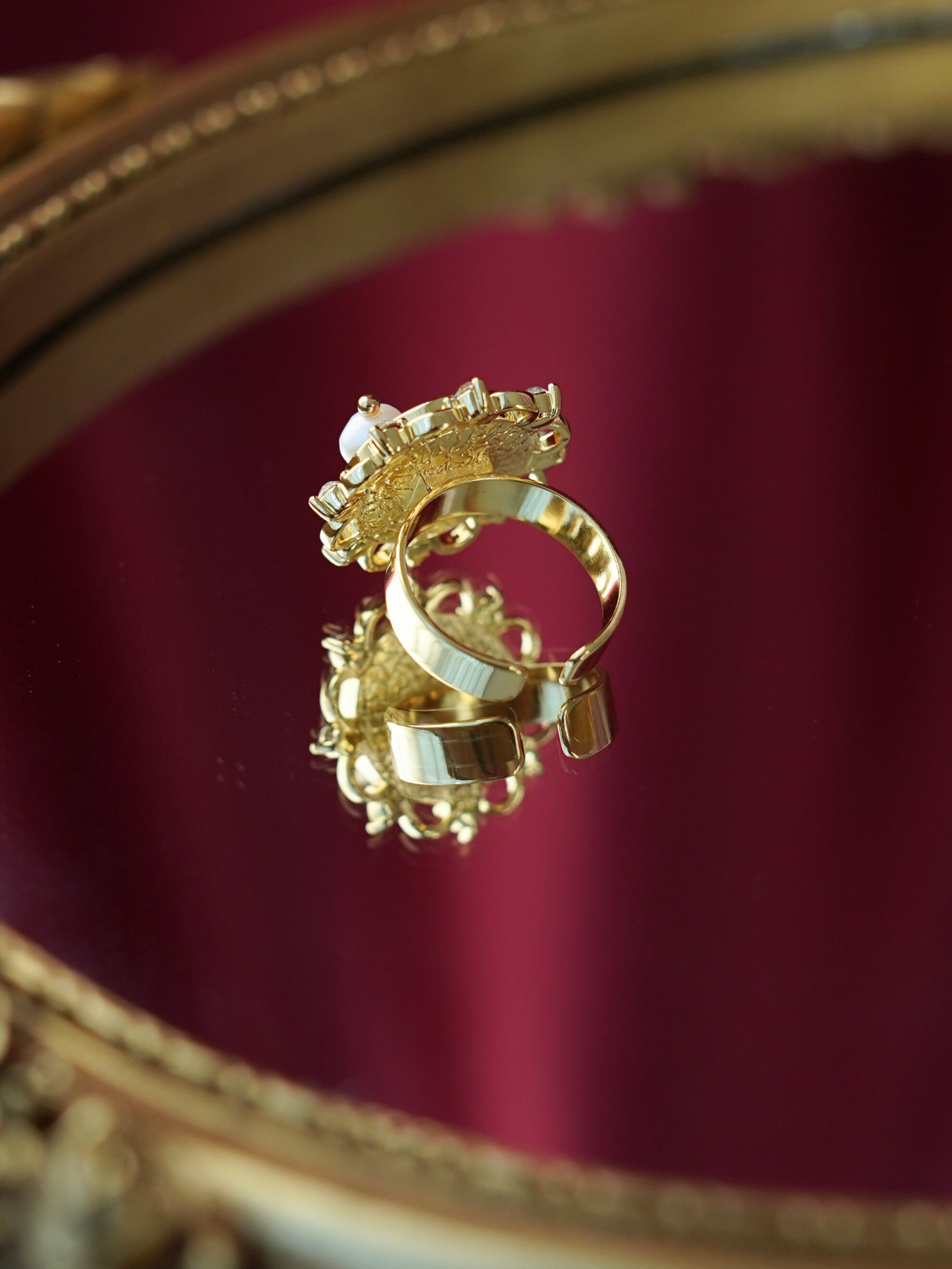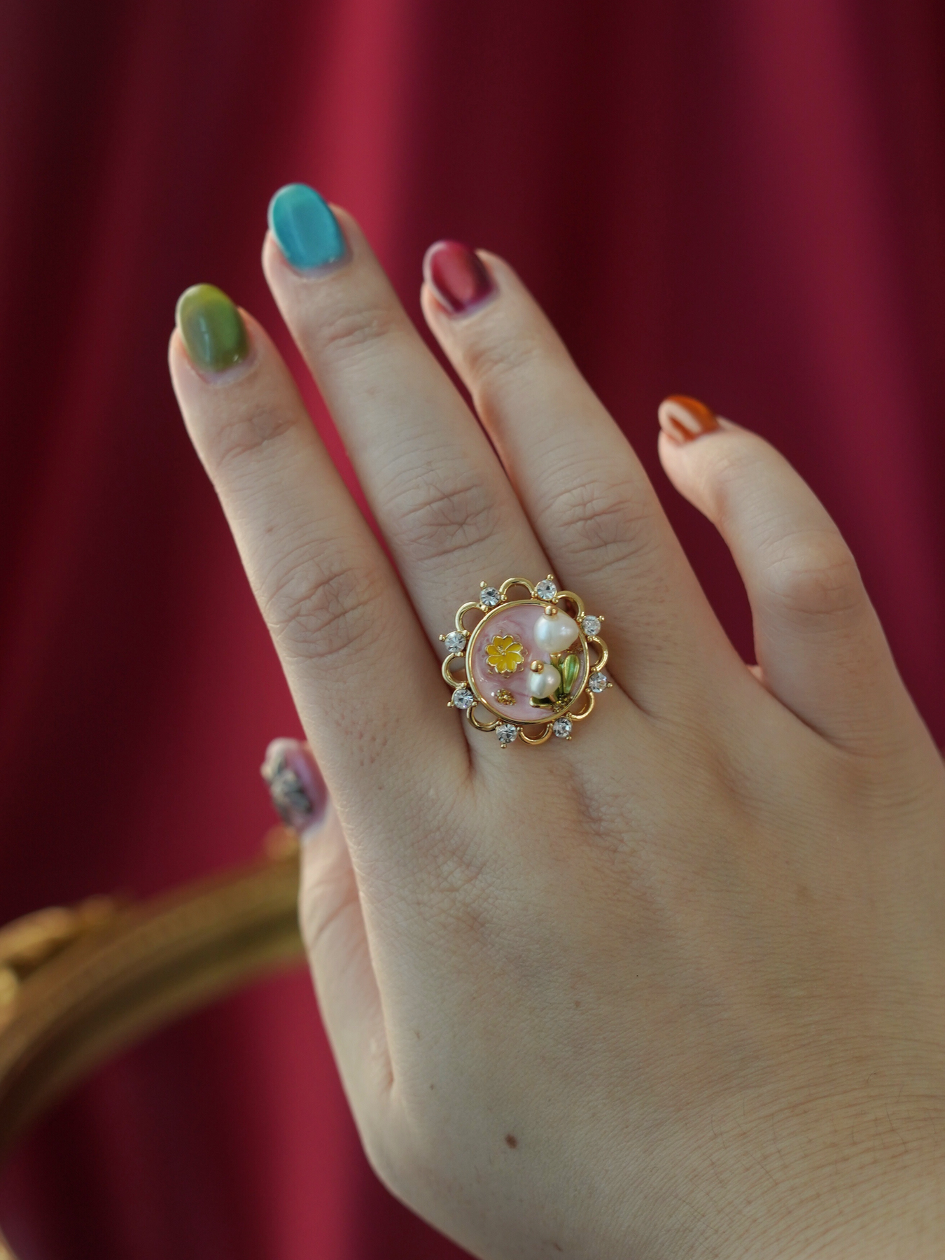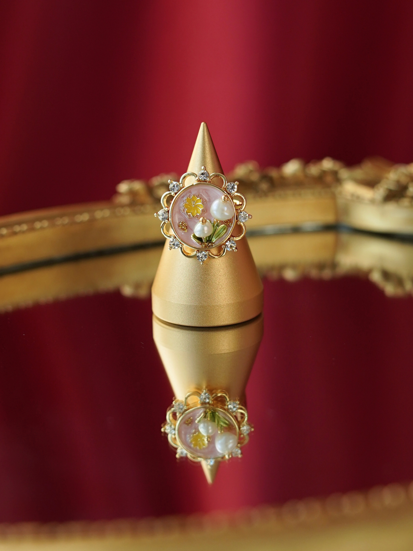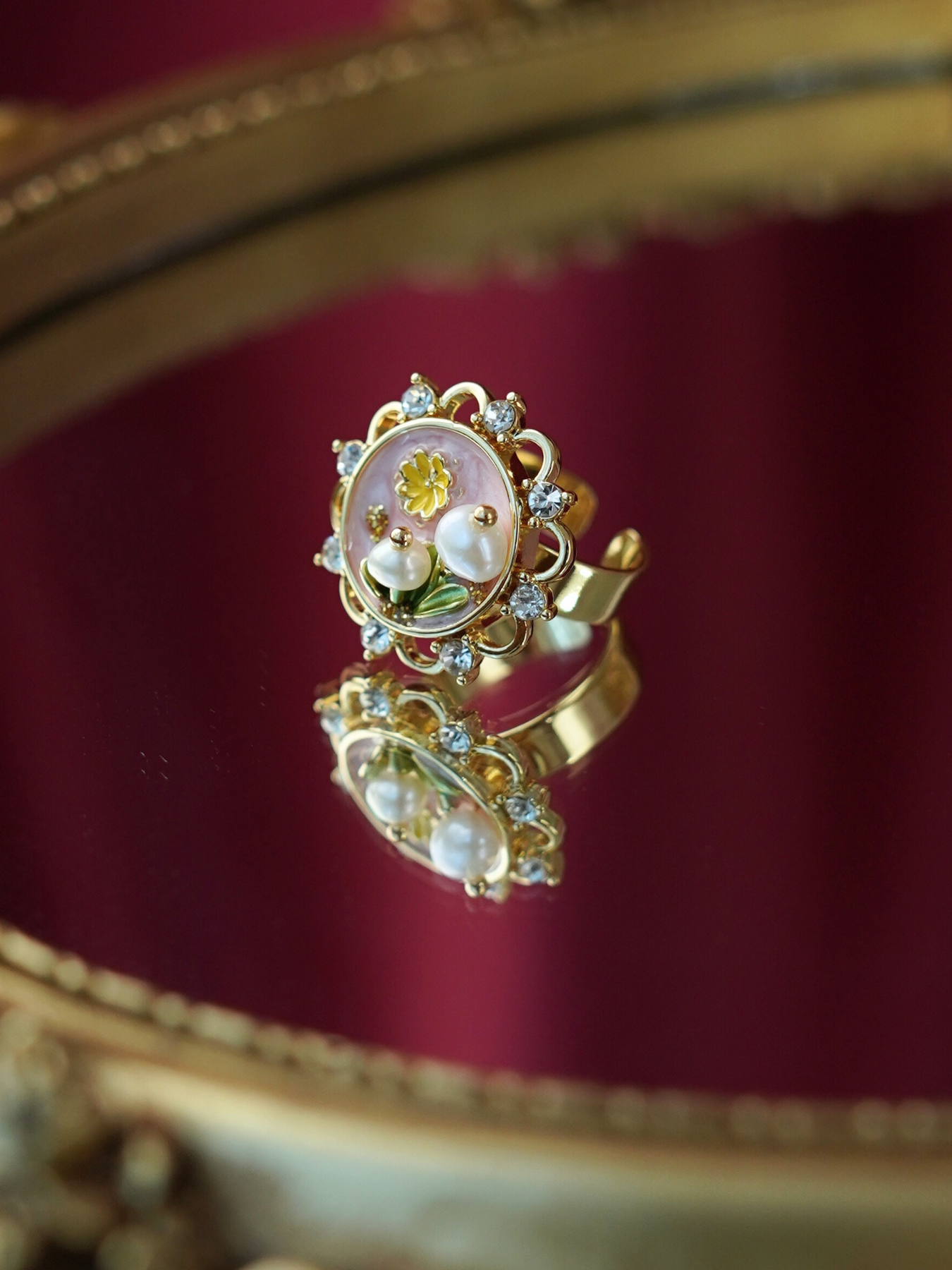 A perfect blend of elegance and artistry, this ring features a freshwater pearl set against delicate enamel detailing, finished with 14k gold plated hardware for a soft, luminous shine.