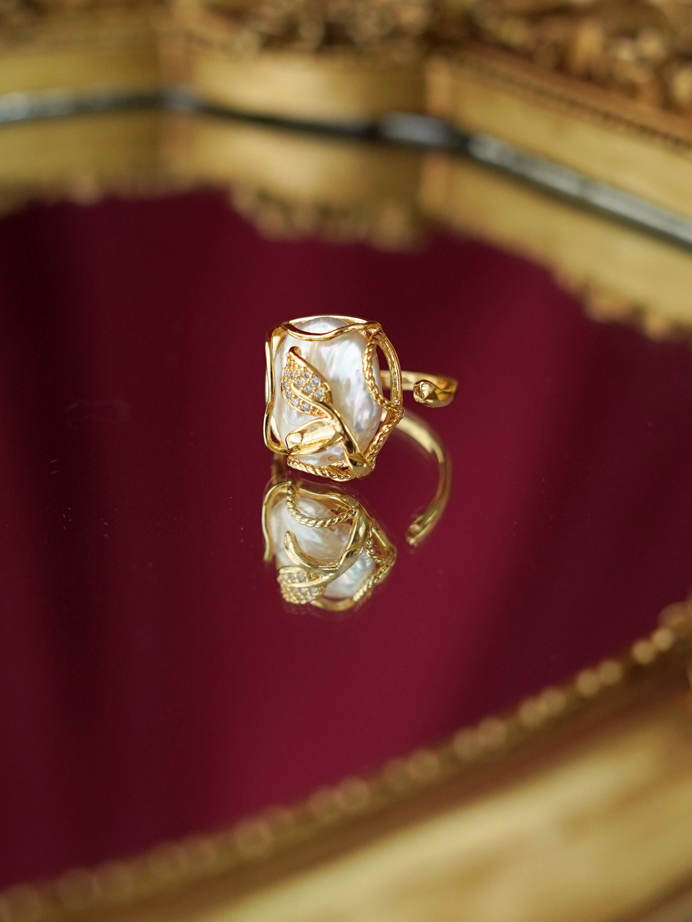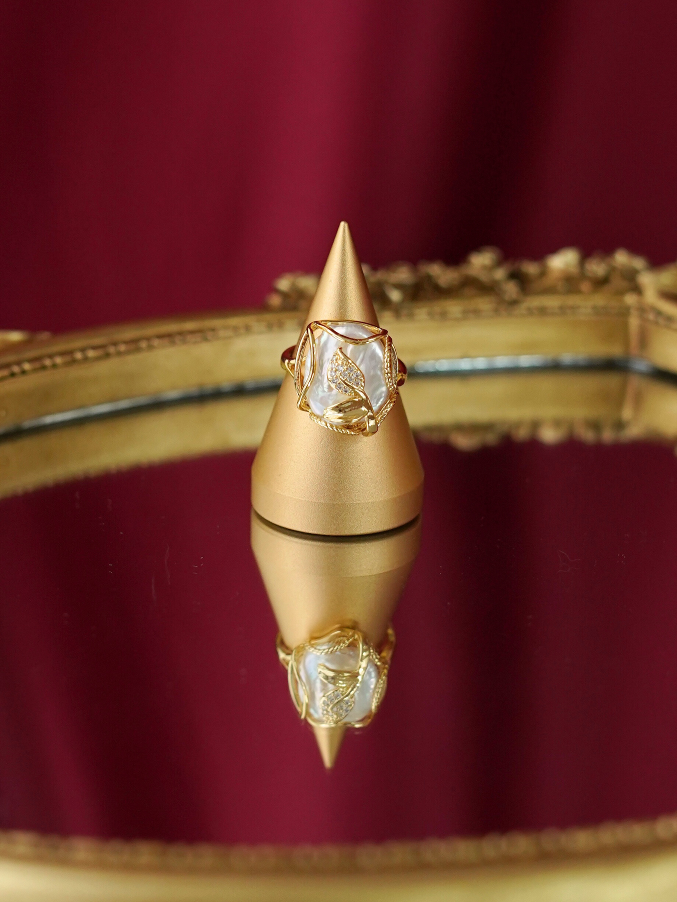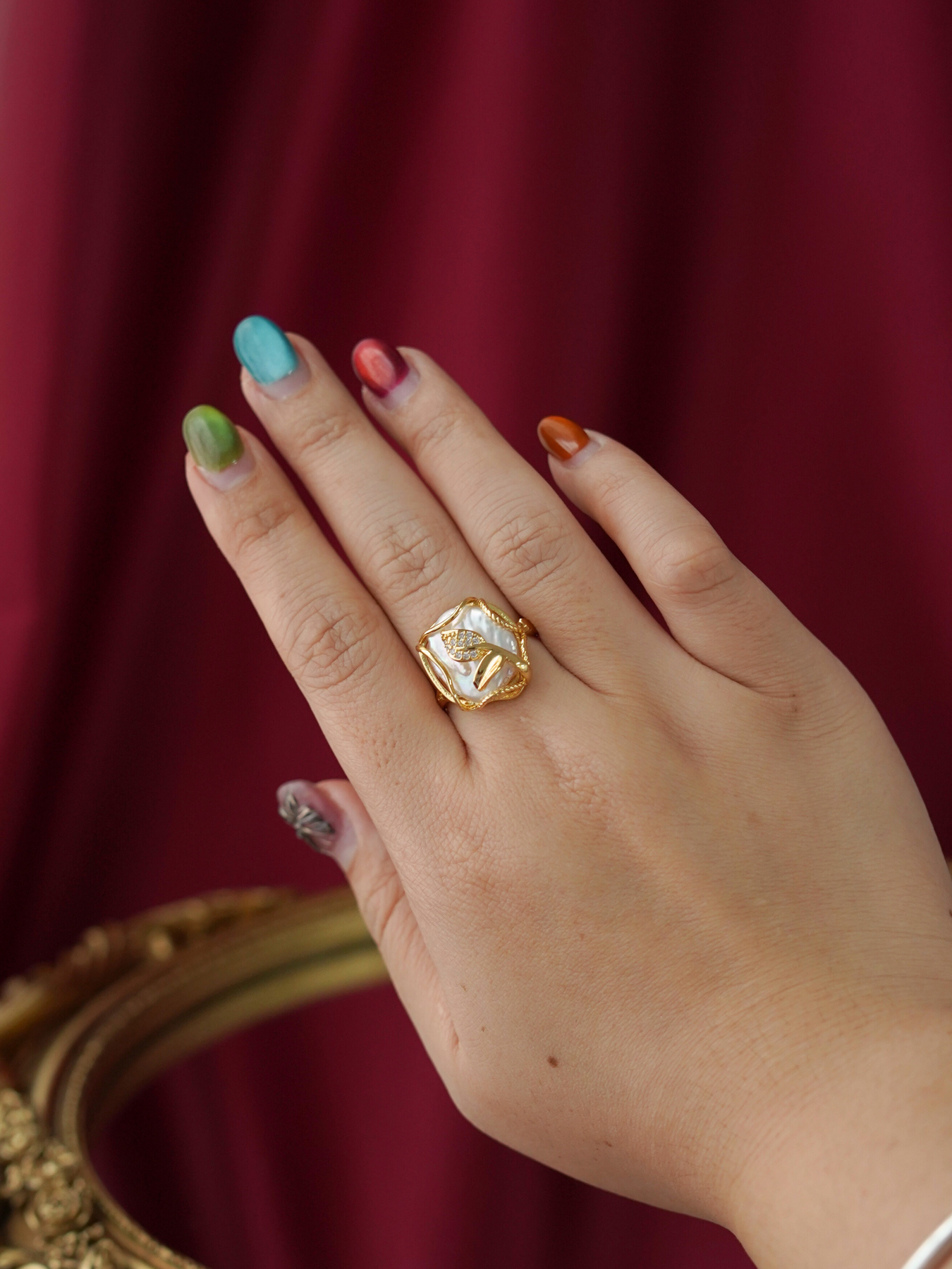 Radiate oceanic elegance with this abalone shell ring, beautifully crafted with 14k gold plated hardware that complements the shell’s natural iridescence.